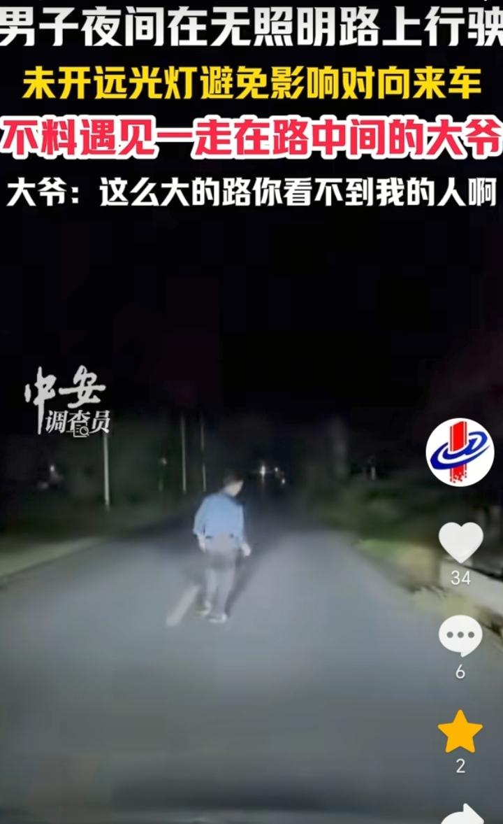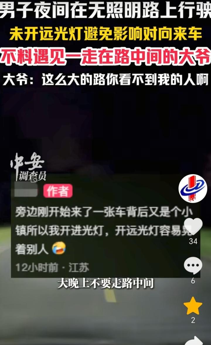 江苏,男子夜间在无照明的路段没开远光灯行驶,没想到遇到走在路中间的大爷。 据中