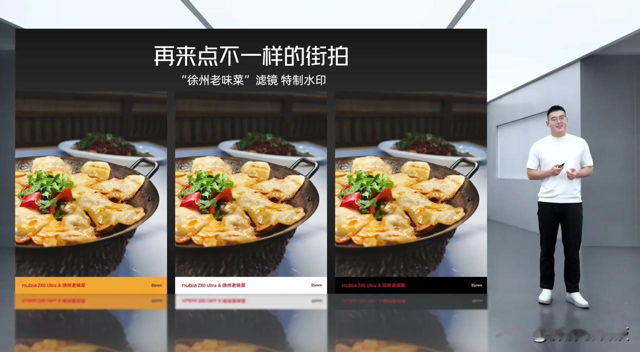 努比亚Z80 Ultra影像部分配置一览,35mm端用上了新的传感器,而且35mm更适合人文街拍。 这次还有全球第五大影像品牌徐州老味菜的滤镜,这个梗可以有,很有意思。 这代滤镜好用度跟色彩都不错,与之前版本相比改变非常大。