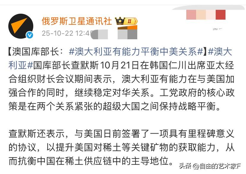 被中方点名后,澳大利亚:有能力平衡中美关系 被南部战区点名之后,10月22日,中国国防部再次就澳大利亚军机侵闯西沙群岛的事情做出了回应。 指责澳大利亚国防部的发声属于颠倒黑白,倒打一耙,解放军拦截澳大利亚军机的举动正当合法,而且专业克制,警告澳大利亚立即停止对中方的侵权挑衅。 面对着中方的警告,澳大利亚国库部长查默斯发声,和美方签订的稀土协议属于里程碑式的协议,有助于帮助美国在对抗中方稀土管制中获取有利位置 强调对于澳大利亚的工党政府有能力有信心,在加强对美国合作的同时还能稳定对华关系, 评论两句:澳大利亚的平衡中美关系可谓是虚假的估计连他们自己都不信,他们所采取的政策不过是一味不顾本国利益跪美舔美,现在嘴硬当中国将055驱逐舰开到澳大利亚海域的时候就不再嘴硬了