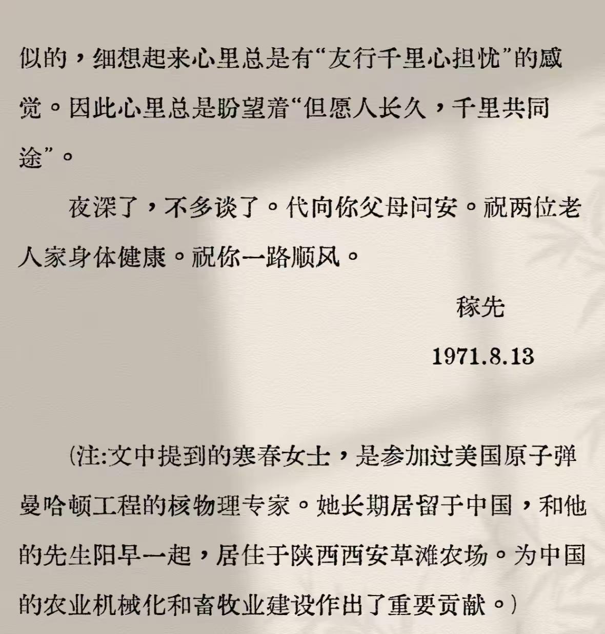 这是两弹一星的邓稼先写给杨振宁的信,据说杨振宁看到这信时,深深的被感动。 写信的背景是1971年他在上海赴宴时,专人送来的加急信件,展开熟悉的笔迹,读到“寒春确实没有参加过我国任何有关制造核武器的事”的明确答复,再看到“但愿人长久,千里共同途”的恳切期盼,他当即热泪盈眶,只能暂时离席去整理情绪。 这份震荡源于民族自豪,更源于对好友坚守的疼惜,让他真切触摸到了祖国核武器事业“无外人参与”的背后,是怎样的孤勇与奉献。 多年后,已是百岁的杨振宁公开坦言,当年初见“千里共同途”未能完全读懂,而今终于可以告慰好友:自己此后半生的选择,从未偏离这条共同的报国之路。 从推动中美学术交流,到在清华创立高等研究院、定居归国任教,他以另一种方式践行了与邓稼先的默契。