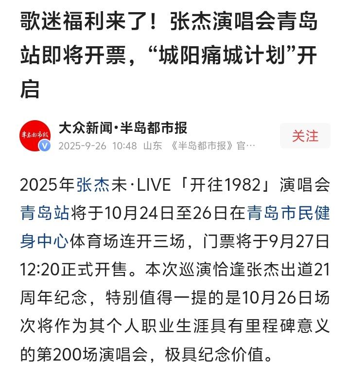 张杰青岛演唱会引爆全城狂欢!十月连开三场,歌迷泪洒现场,城阳区打造“痛城计划”宠粉无底线 (来源:半岛都市报、九派观天下、青岛文旅等综合整理) 当音乐与城市共鸣,张杰的歌声即将点燃青岛的秋夜。10月24日至26日,青岛市民健身中心体育场将迎来2025张杰未·LIVE「开往1982」世界巡回演唱会,连开三场的盛况堪称年度压轴狂欢。这场演唱会不仅是张杰出道21周年的深情回望,更将见证他职业生涯第200场演出的里程碑时刻。消息一出,无数“星星”们热血沸腾,仿佛青春的记忆瞬间被拉回那些单曲循环的夜晚。 为何这场演唱会如此令人疯狂?从鸟巢到青岛,张杰用实力证明了自己“live王”的称号绝非虚名。此前各站演唱会上,滑动地屏、裸眼3D技术与超炫音响的完美结合,早已为乐迷打造出沉浸式的视听盛宴。而此次“开往1982”主题,更似一场穿越时光的约定——从《天下》的豪情到《少年中国说》的激昂,每一首歌都是青春与梦想的烙印。 青岛歌迷的等待终于迎来圆满。上一次张杰在青岛开唱还是2017年的“我想”巡演,时隔八年,这座城市早已积攒了太多的期待。社交平台上,有人晒出珍藏的旧票根,有人调侃“从学生党熬成宝妈,终于等到了”;更有外地粉丝豪言“打飞的要来,为杰哥扛起应援大旗”。音乐的魅力,从来不止于旋律,而是那份刻进生命的情感共鸣。 令人惊喜的是,城阳区文旅局此次联手张杰官方歌迷会,推出“痛城计划”——这名字乍听戏谑,实则藏着满满的宠粉心思。整合15家商户、近200个品牌,从酒店专属礼包到商圈折扣礼遇,甚至应援主题客房和接驳巴士,全方位覆盖“吃住游购”。比如鑫江温德姆酒店的粉丝套餐、东方伊甸园的音乐快闪,让追星之旅升级为城市深度体验。 “痛城”二字,巧妙戳中了当代年轻人的自嘲文化。追星路上,钱包“痛”并快乐着,但城阳区却用行动告诉粉丝:这一次,让你们痛得值!有网友笑称:“这波操作比抢票还让人心动,直接给青岛文旅上大分!”的确,文旅与音乐的跨界联动,不仅拉动了消费,更让一座城市因一场演唱会而变得温暖。 张杰的演唱会,从来不只是唱歌那么简单。他总能在舞台上用真诚打动人心——唱《逆战》时全场沸腾,唱《他不懂》时万人落泪。而此次青岛站,据说他还准备了城市限定曲目,吊足胃口。有乐评人分析:“张杰的厉害之处在于,他让每首歌都像在讲述自己的故事,却又让听众觉得那是自己的人生。” 随着开票日临近,抢票大战一触即发。大麦平台上的预约量早已突破十万,不少粉丝摩拳擦掌定好闹钟,甚至提前演练点击速度。有人调侃:“抢张杰的票比高考还紧张,但为了青春,拼了!”这种集体狂欢的背后,其实是人们对纯粹情感需求的渴望——在快节奏的生活中,一场演唱会成了逃离现实、拥抱自我的出口。 从成都少年到华语顶流,张杰的21年音乐路,恰似一代人的成长缩影。他的歌声里,有懵懂的爱恋,有热血的坚持,也有中年的豁达。而青岛这场演唱会,或许正是许多人与自己青春和解的契机。正如一位粉丝留言:“听的是歌,追的是岁月,而杰哥是那段岁月里最亮的星。” 张杰青岛演唱会 引爆全城狂欢十月 连开三场城阳痛城计划 宠粉 青岛文旅