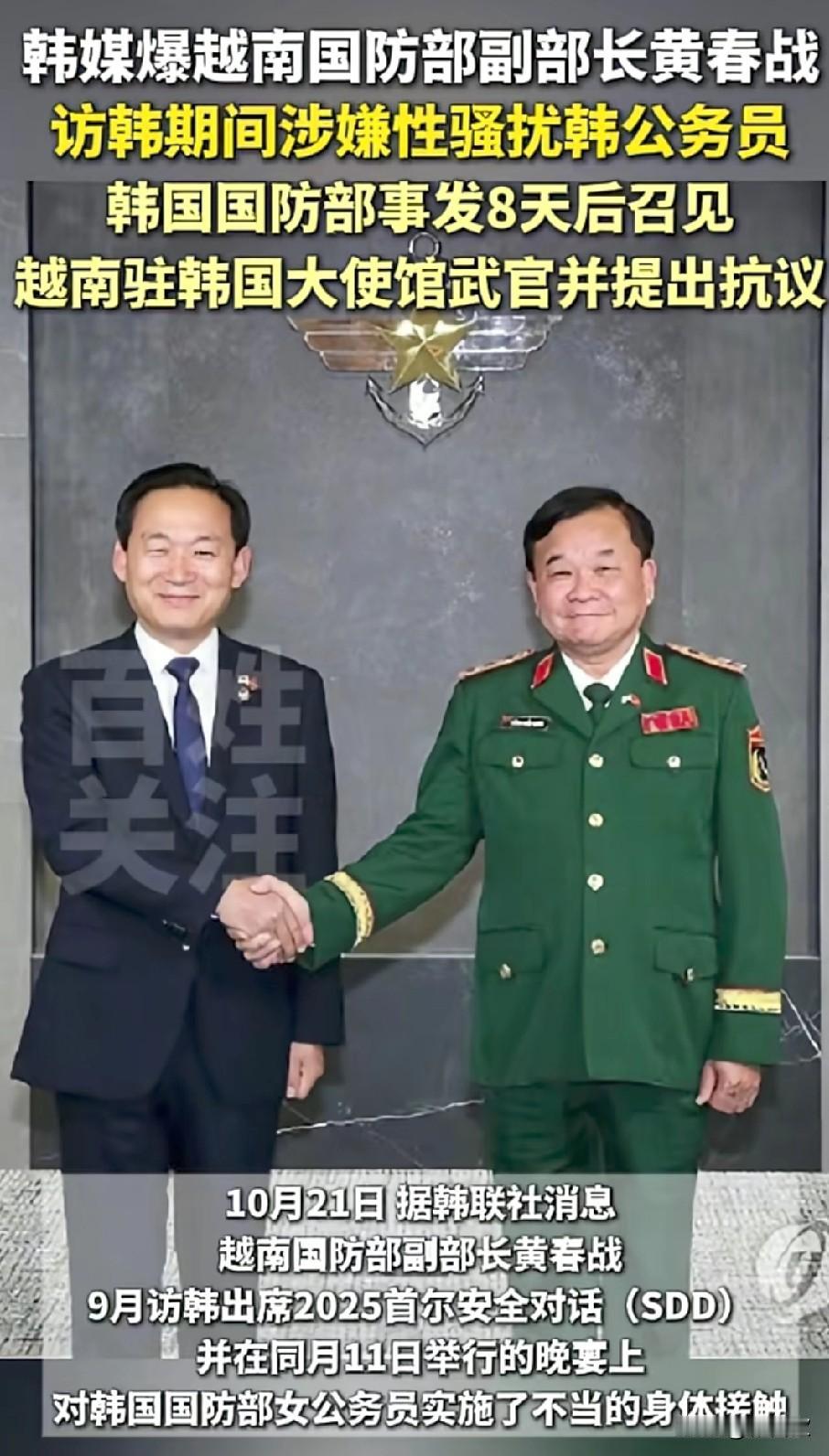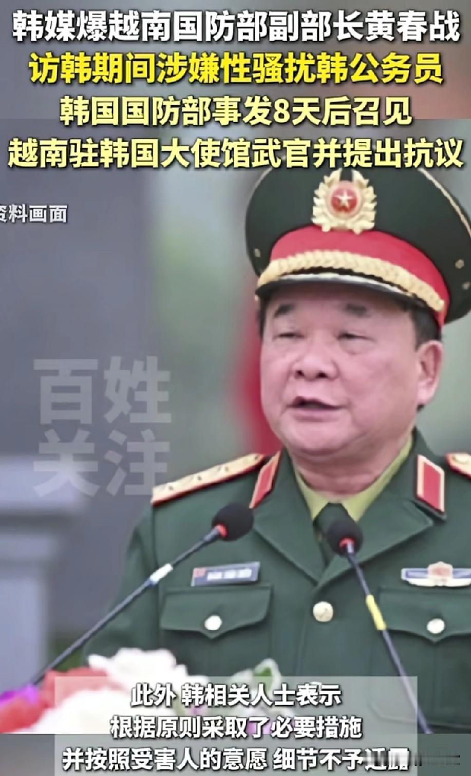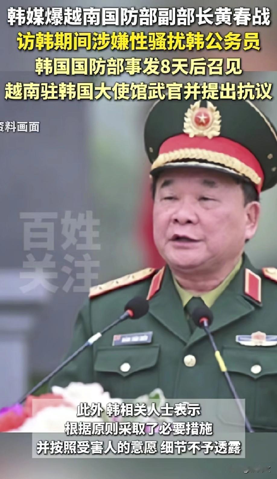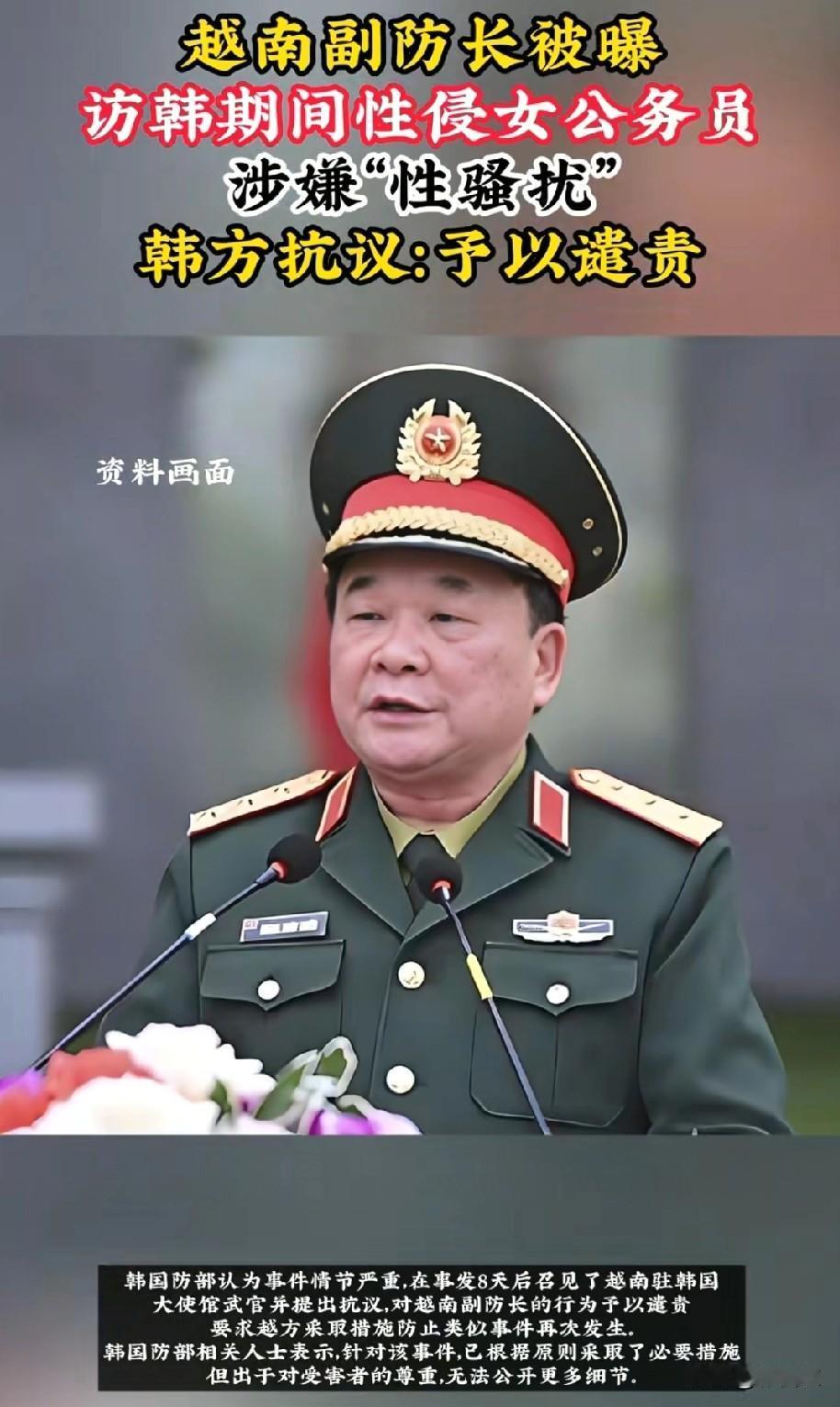 真的非常好奇那位韩国女公务员有多漂亮!越南副防长深陷泥潭无法自拔, 顶着上将头衔去韩国参会,居然在官方 晚宴上对韩国女公务员搞“不当身体接触” 。 这事儿韩方都直接召见越南武官抗议了,可见情节多严重。 总有人往“倾国倾城”上扯, 其实搞错了重点。 这本质是权力者的失德, 跟受害者长什么样没关系。 身居高位却管不住自己的手, 丢的是国家颜面,毁的是职业操守。 更扯的是说什么“仙人跳”, 韩方明确说了要尊重受害者, 没曝细节不等于有猫腻。 职场骚扰从来不是“对方太诱人”, 而是施暴者没底线。 你说,这种打着公务旗号的失范行为,该怎么杜绝?
