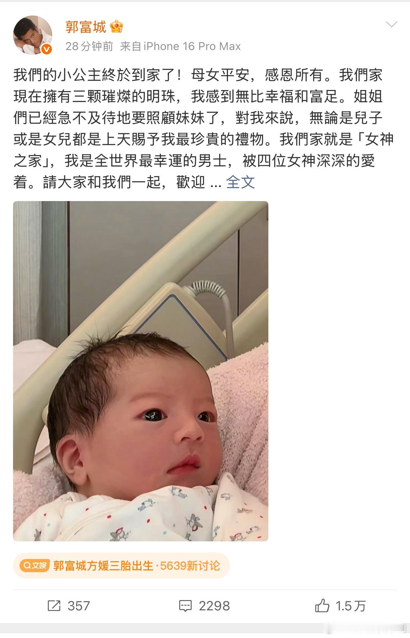 郭富城官宣三胎出生,好漂亮的小公主,眼睛亮亮的!郭富城方媛三胎出生