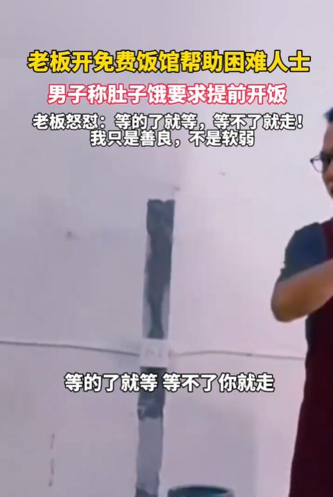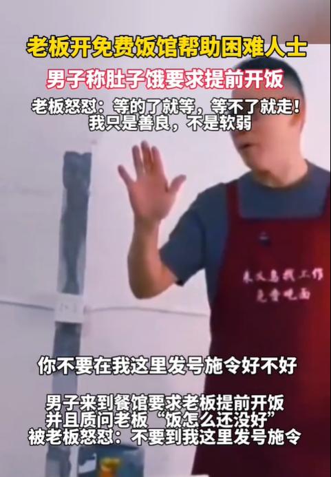 浙江义乌,一男子到免费餐馆吃饭,由于实在是饿了,于是就大声催促老板动作快点。老板不满男子的语气,没有惯着对方,直接回怼:“我只是善良,但我不软弱!你等的了就等,等不了就走。”(来源:顶端新闻) 据悉,涉事餐厅已经开了很多年了,给一些有困难的人士提供免费餐食。由于老板的善举被一传十,十传百,几年下来,有不少有困难的人来到这里免费用餐,也让老板积累了十分高的声望和口碑。 对于老板的善举,有不少人是支持的,但也有不少人担心,会有人觉得理所当然,不懂得感恩。 没想到这还真被网友们给料到了,在今年的10月17日那天,就有一名男子来到这家免费餐厅无理取闹了。 从网传视频来看,这名男子穿着一件蓝色的长袖外套,他10点多就来到餐厅,而此时老板和员工们还在忙碌地准备饭菜。 男子可能等得不耐烦了,嘴里不停嘀咕,随后便开口向老板要塑料袋,说打算把饭打包带走。 老板并没有答应,毕竟他们这里是提供的免费餐食,如果还要袋子打包,那就会增加成本,更何况打包的话,有可能会被人钻空子。 可谁能想到,在被老板拒绝打包后,男子瞬间变了脸,大声抱怨说:“那你赶紧烧啊,我肚子饿了!他们都说10点就能吃饭,怎么现在还不开饭?” 老板听到这话是又好气又好笑,反问对方:“谁跟你说的10点开饭?” 男子理直气壮地说:“是他们说的,10点吃饭!” 老板见此也不再客气,直接回怼了过去:“我只是善良,但不是软弱,你别在我这儿发号施令,愿意等就等,等不了就走。” 老板的一番话虽然没留情面,但不少网友纷纷为老板点赞。有网友说:“就算饭店也有个开饭时间吧。”还有网友表示:“人家给你提供免费吃饭,你却把老板当店小二指使,这摆明了农夫与蛇。” 然而有部分网友却认为老板说话有点刻薄了,也许男子是真的有特殊情况,才会这么着急,不该用这种语气说话的。 其实老板开设免费餐厅为那些困难的、有需要的人提供餐食,这不是法定的义务,而是他个人的一种善良、助人为乐的精神。 不过,男子的话虽然气人,但从法律上来讲,也没有什么违法的地方,顶多就算是不懂得尊重人,这属于道德层面的事,所以只能从道德上进行评价。 但这里要提醒老板的是,这种好事还是尽量不要做。 首先,一旦这些人吃饭菜时吃出了问题,即便是免费提供的菜饭,没有收取任何费用,也是要承担相应责任的。甚至食品安全部门和市场监管部门还得来行政处罚。 其次,即便饭菜没有问题,但万一有人在老板的店里摔伤,老板未尽到安全保障义务,也是要承担责任的。 《民法典》第1198条规定,宾馆、商场、银行、车站、机场、体育场馆、娱乐场所等经营场所、公共场所的经营者、管理者或者群众性活动的组织者,未尽到安全保障义务,造成他人损害的,应当承担侵权责任。 由此可见,老板好心为他人免费提供餐食,但从法律上来说,并不一定会有好的结果。 不过,老板可以提供免费的场地,可以为他们备些菜,让他们自行清洗做饭,同时也要收取相应的费用,哪怕1块或者2块也行。纯免费的并不一定会让人心存感激。 最后,善意是需要被尊重的,更需要被守护,老板提供免费餐食值得我们赞扬。 对此,您怎么看?欢迎留言交流。