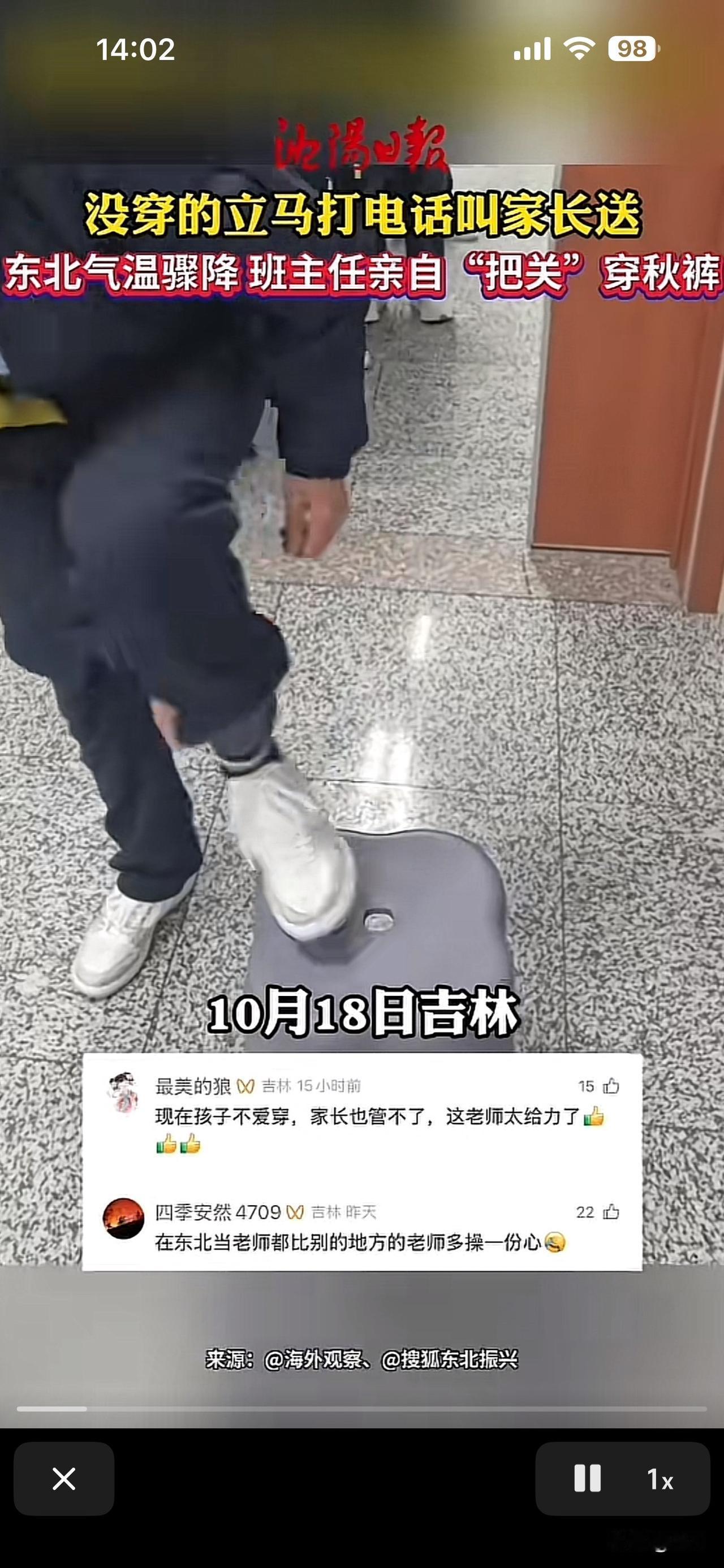 负责人的老师🧑🏫让人暖心 小编发现,近期东北气温下降厉害,每个学生入座前都需要检查是否穿“秋裤”,没穿秋裤的立刻打电话给家长,要求送过来,不然就站着听课。网友纷纷点赞,大家怎么看?