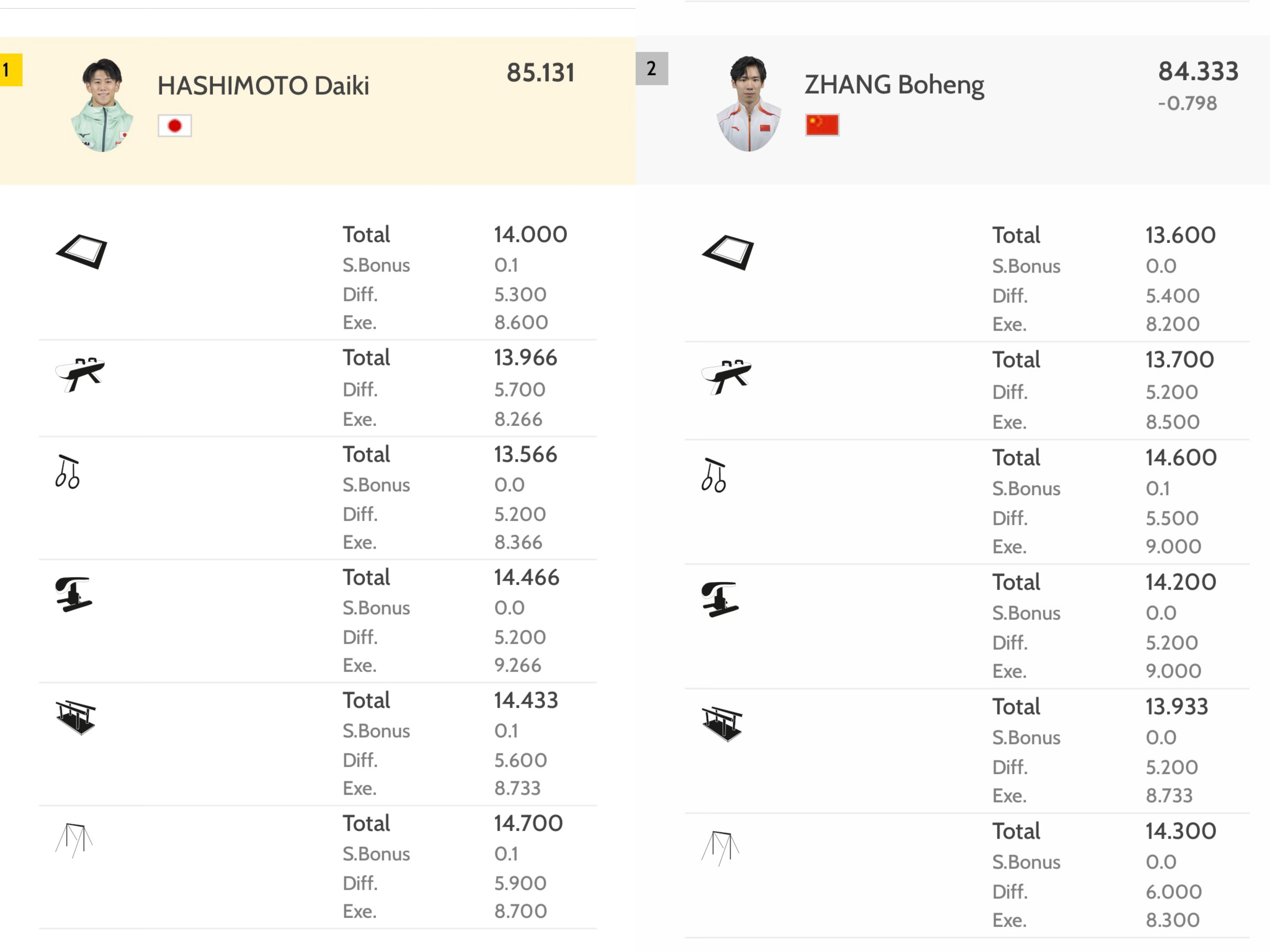 桥本大辉有4个14+分项目(自由操 跳马 双杠 单杠)
