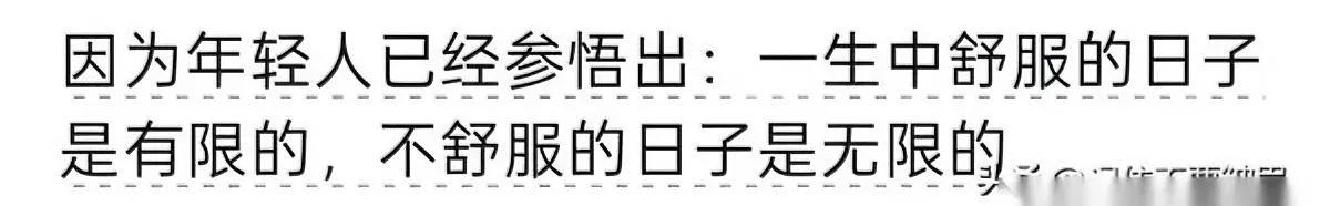 别信先苦后甜的鬼话! 你见过先苦真的能后甜的吗? 那些说“先苦后甜”的人,可能忘了生命是有保质期的。就像蜡烛,一直猛烧只会早早熄灭,哪有时间等“甜”来?这几年多少年轻人被房贷、加班套成“苦行僧”,嘴上喊着“熬过去就好”,身体却先垮了——医院肿瘤科里,可不全是老年人。 数学早就算明白了:你越能吃苦,生活就越会给你苦吃。加班换的钱可能不够看病,熬夜赚的项目可能拖垮婚姻。与其把希望押在未知的“后甜”,不如趁年轻选条“先甜”的路——钱少点就少点,至少能睡够八小时,能陪爱人吃顿晚饭,能在周末看场电影。 苦难从来不是勋章,把自己榨干去换“成功”才最傻。人活几十年,多舒服一天就是赚一天,这账难道算不明白? 你是愿意当“先苦后甜”的赌徒,还是“及时享甜”的聪明人?评论区聊聊!