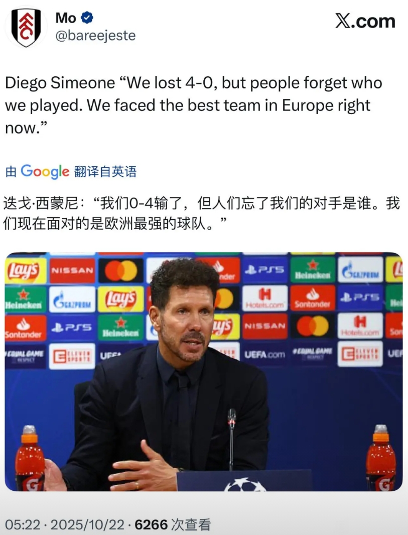 西蒙尼心服口服,说输给阿森纳不丢人,因为他们是欧洲最强的球队!