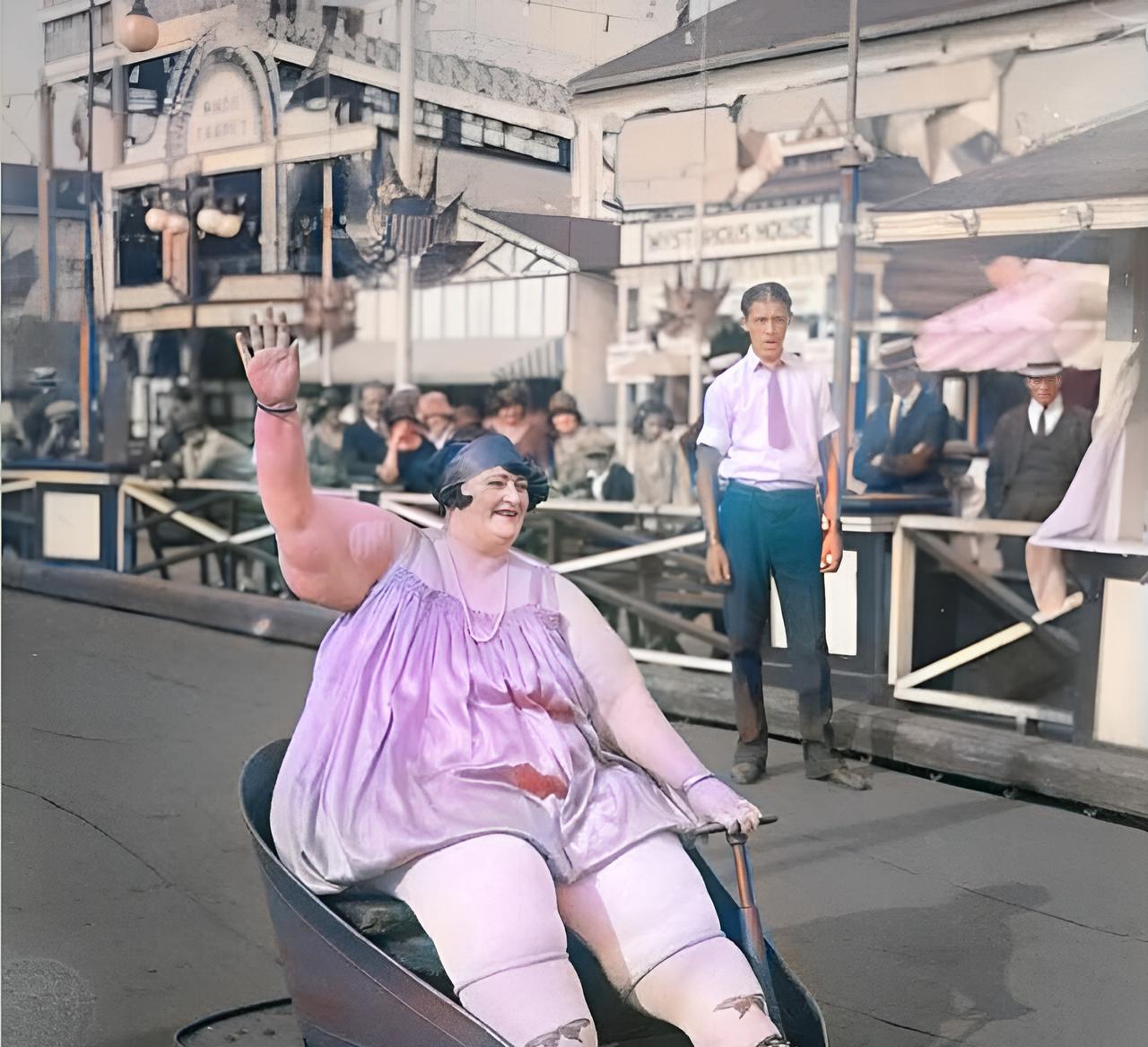 这是1925年8月24日,纽约举办了一场特殊的比赛。参赛对象都是超级胖的女孩。这场比赛就是从这些胖女孩中选择最胖的一位。 这位最胖的女孩将是这场比赛的冠军。冠军将获得25美元。这些钱虽然不多,但无需吹灰之力就能获得这笔钱也很令人满足。因此,许多自认为自己能获得冠军拿到奖金的女孩纷纷参加比赛。可是,一山更比一山高。 当她们一个个过称之后。冠军毫无疑问地就出现了。照片上的这个女孩成功夺得冠军。当时,她的体重为620磅(281.23公斤)。她看似不是非常胖,但肉很压实,体重达到560多斤。其他参赛者瞬间自甘不如。赛后,这名女孩坐着专为她设计的电动车向人群挥手,告诉众人冠军非他莫属。众人也向她投去羡慕的目光。