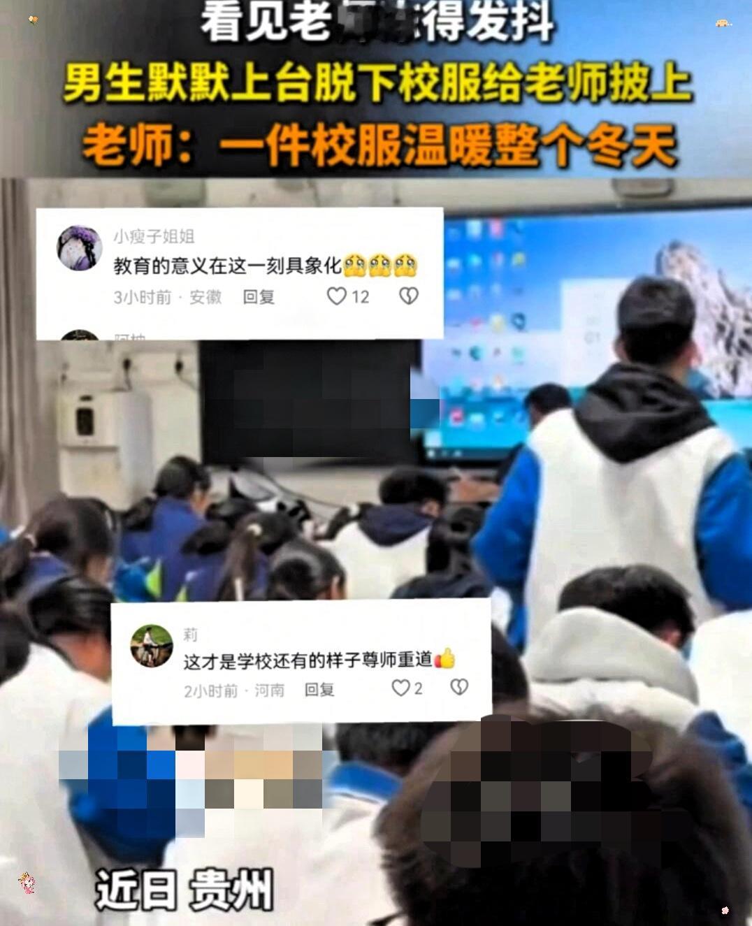 这一刻成绩已经不重要了! 贵州,老师在讲台上看着学生们自习 ,后排一位男同学突然走上了讲台, 原以为是问问题,没想到男同学竟然将自己的校服外套脱下给依旧身穿短袖的老师披上! 这一幕看得人心里发烫,比任何满分试卷都让人动容。 降温突袭,老师忍着凉意坚守讲台,学生悄悄捕捉到她发抖的细节,用一件校服递去温暖——没有刻意煽情,却藏着最纯粹的心意。 教育的本质从不是分数的较量,而是爱的传递。 老师用责任守护课堂,学生用细心回应温暖,这场双向的奔赴,才是校园里最动人的风景。 那件略显宽大的校服,裹着的不仅是暖意,更是孩子刻在骨子里的共情与善良。 比起教出多少高分学生,教会孩子懂得感恩、学会爱人,才是教育最珍贵的成果。 你上学时,有没有过和老师之间的暖心小事?评论区分享下这份温暖吧!