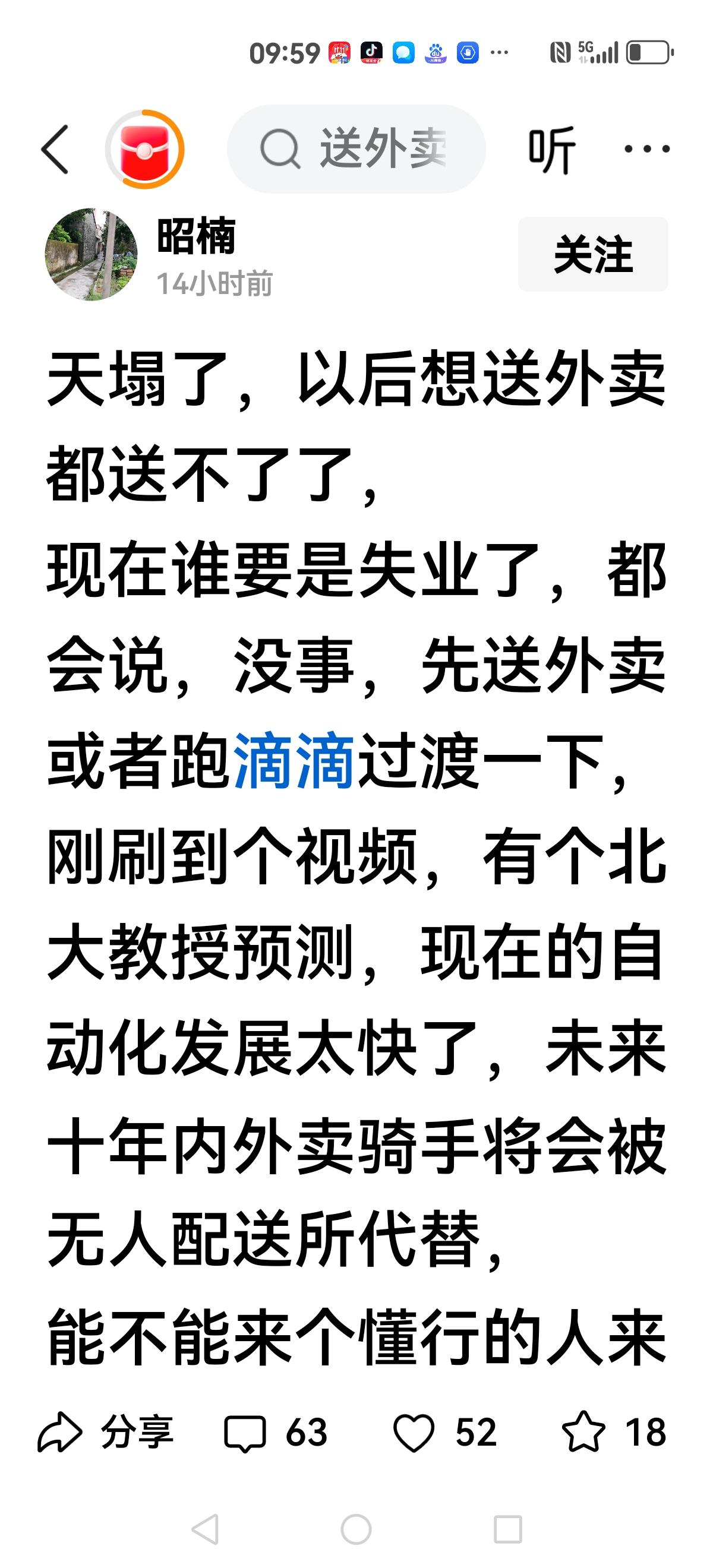刘强东说过:科技发展不是增加劳动力,而是在不断用机器人替代劳动力。 有位教授预测:未来十年,无人滴滴,无人机送外卖,即将使外卖员,快递小哥统统下岗,那么底层人员去哪里就业?