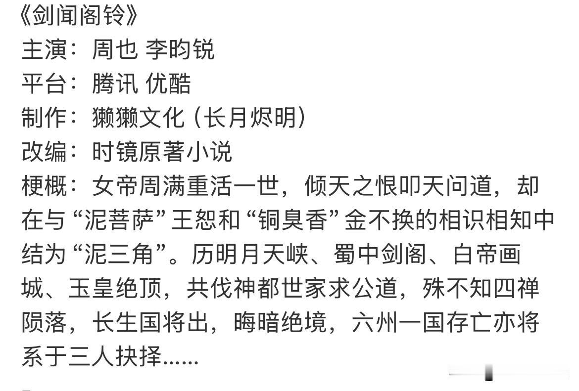 10月23日,周也跟李昀锐将合作《剑闻阁铃》,本来想着周也孟子义是闺蜜,李昀锐跟周也搭档,会不会像当年杨幂刘恺威唐嫣那样,拍完直接给闺蜜情拍碎了…… 后面看了剧情了解完后,感觉不太会,这部剧的cp线很少,重点不是感情线,在小说特别好看,新题材,且备受好评的情况下,还是期望他们能拿下这部剧的! 双平台制作模式,实属罕见,以前都是拍完分流,现在一起做,共担风险的同时,又共同承担了拍摄成本,这也算是一件好事! 这部剧最早也得要明年二三季度才会开拍,先观望一下吧!