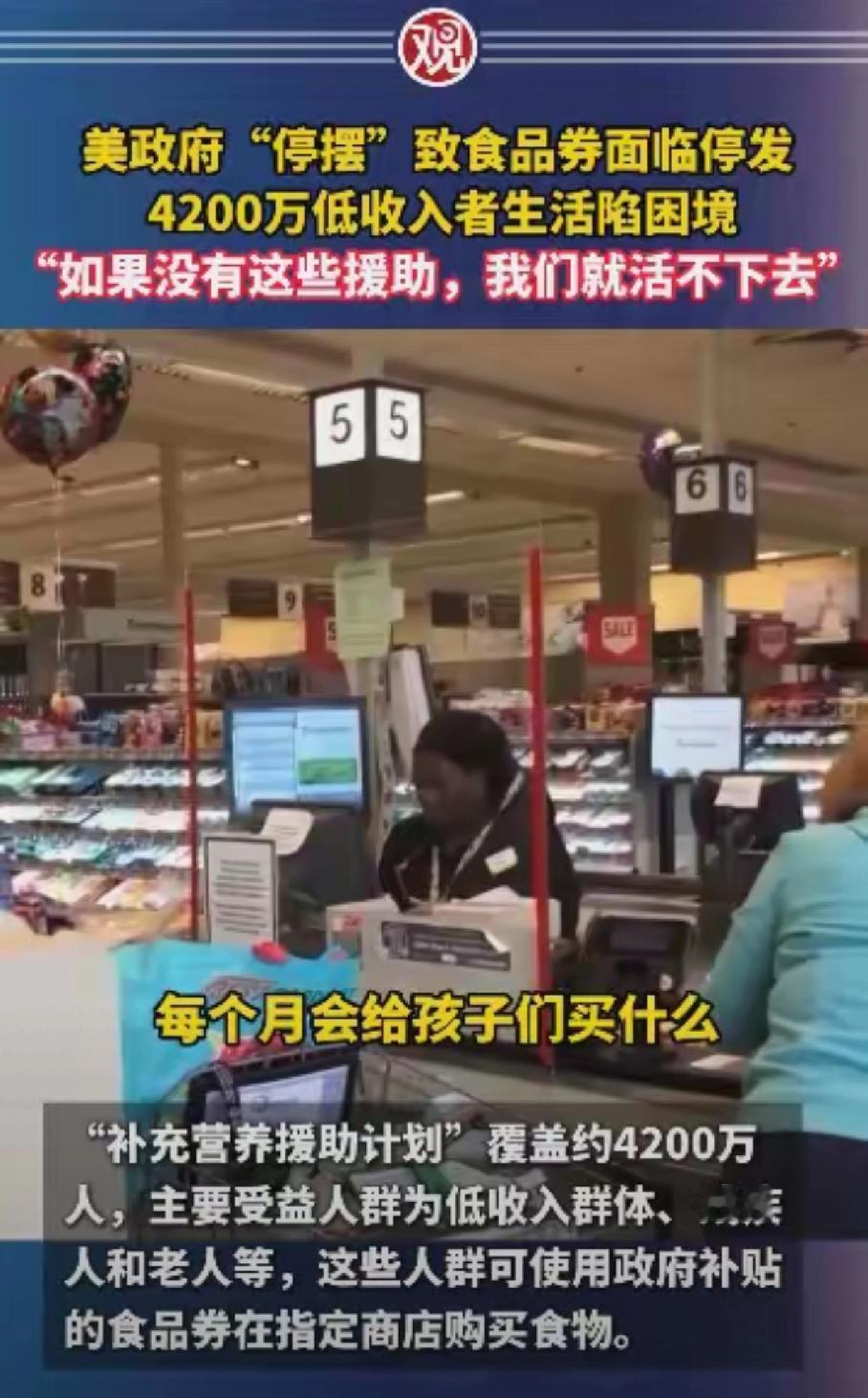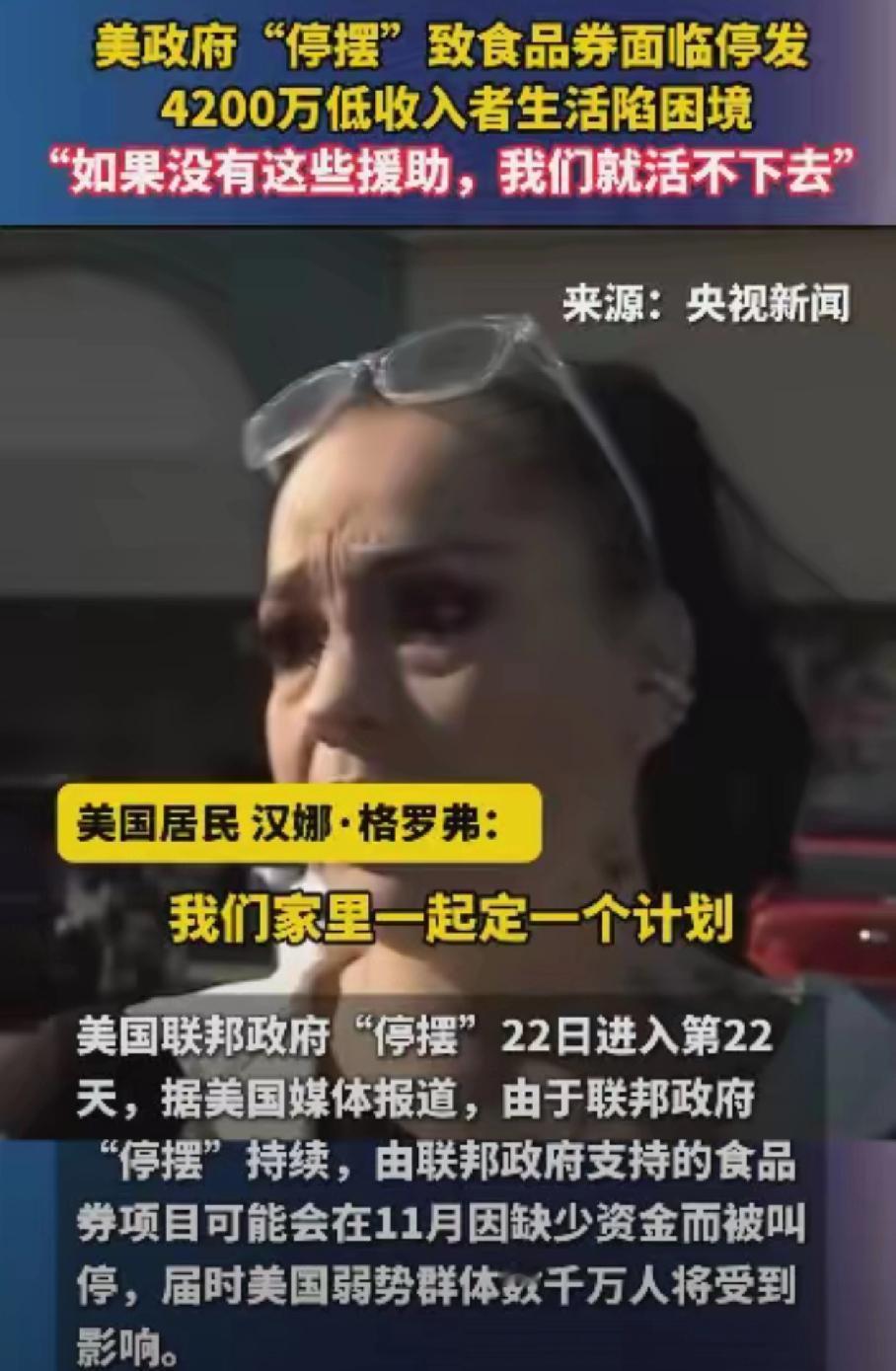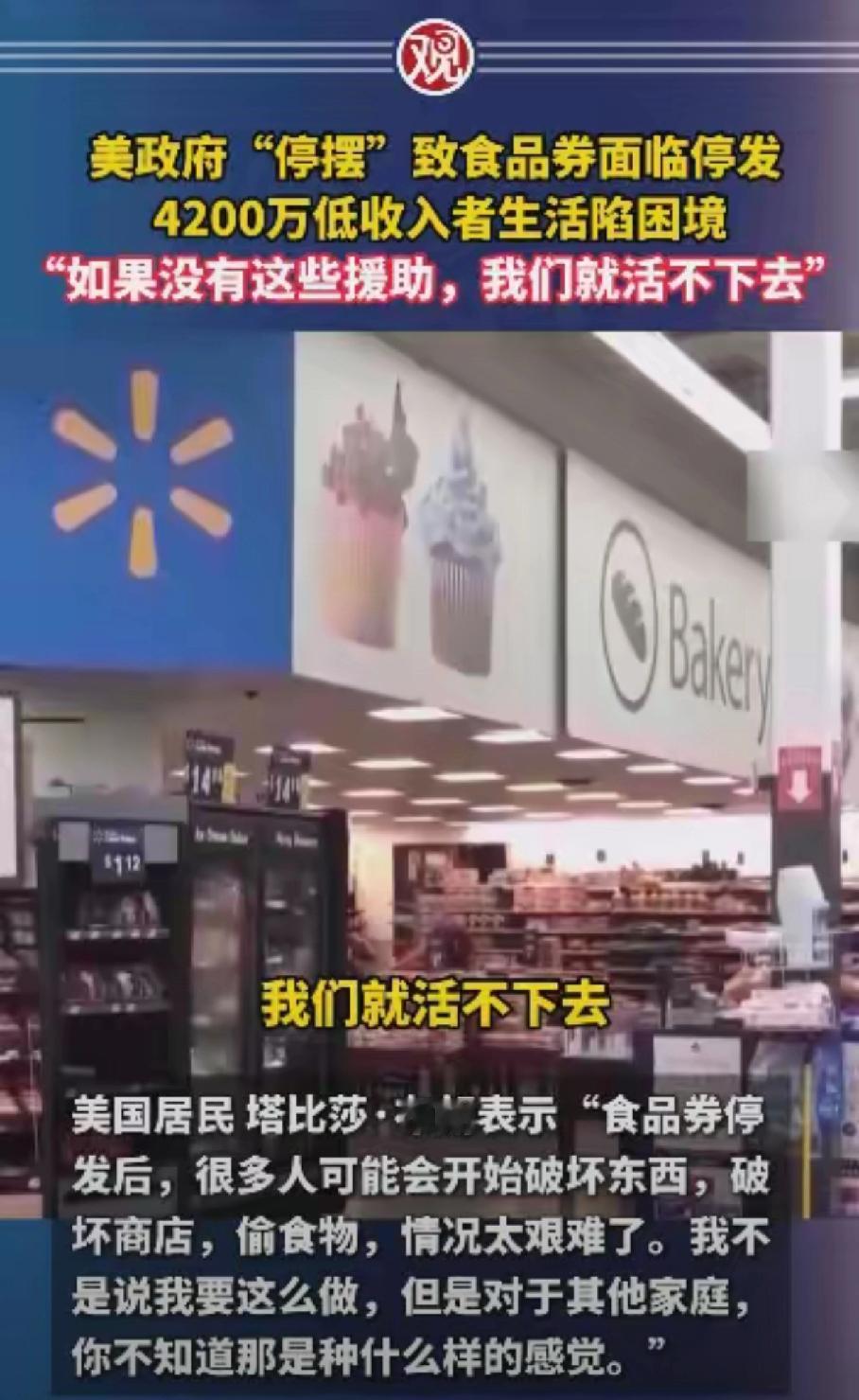 哎呀!美政府“停摆”,4200万人将“活不下去”,这不对吧?不是说福利一级棒吗? 刚刚看到一个有意思的信息,美政府停摆,食品券停发,将让4200万低收入群体陷入困境。 然而,这不是全部。 它将带来一系列问题,比如,破坏商店(0元购)、偷窃,而这将导致这些低收入群体“活不下去”…… 看到这个信息,我忽然想起来那个美国回来的老人,她们不是说美福利一级棒,不仅看病不要一分钱,还给配翻译,还有近乎免费的居所吗? 这咋不一样呢? 肯定有一个是在骗我,谁呢?