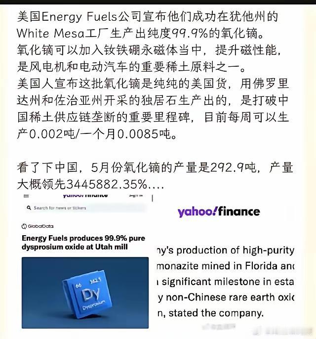 美国宣布重大稀土生产成果,评论区开始起哄了! 美国人是真会讲故事啊,昨天宣布成功在犹他州的工厂提炼出氧化镝。 标题挺吓人,再一深入了解内容又笑死个人。美国人提炼出的纯度是99.9%,99.9%看似挺牛了,可是在工业上根本不管用,不可用。你知道中国提炼出的纯度是多少吗?99.9999%,小数点后面整整比他们多了三个9。 再看产量,乐子更大,月产量只有8500克,每天不到300克。我估计这是在实验室里用烧杯用置换反应一点点抠出来的吧? 那中国呢?五月份氧化镝的产量是292.9吨, 是美国的3445882.35倍。 那么,既然如此美国的宣传到底有什么意义? 对此,很多网友的留言还是看破了实质:史密斯专员又缺钱了!