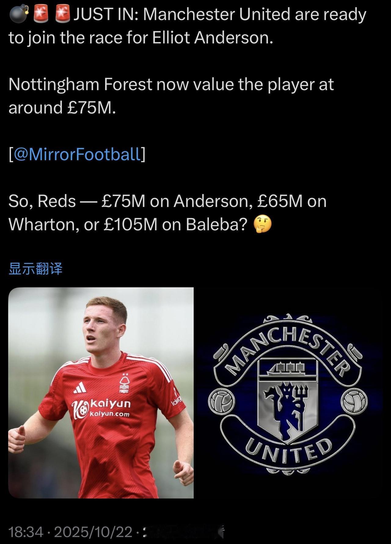 镜报的消息[呲牙] 最新消息:曼联准备加入对艾略特·安德森的争夺。 🔴诺丁汉森林目前对这名球员的估价约为 7500 万英镑。 ……………………………………………………………… 曼联的选择: 🔴7500 万英镑买下安德森 🔴6500 万英镑买下沃顿 🔴1.05 亿英镑买下巴莱巴 如果明年B费和卡塞米罗走了,那曼联应该需要买2中场,如果同时也把乌加特处理掉了,那这3个都应该买[呲牙]。