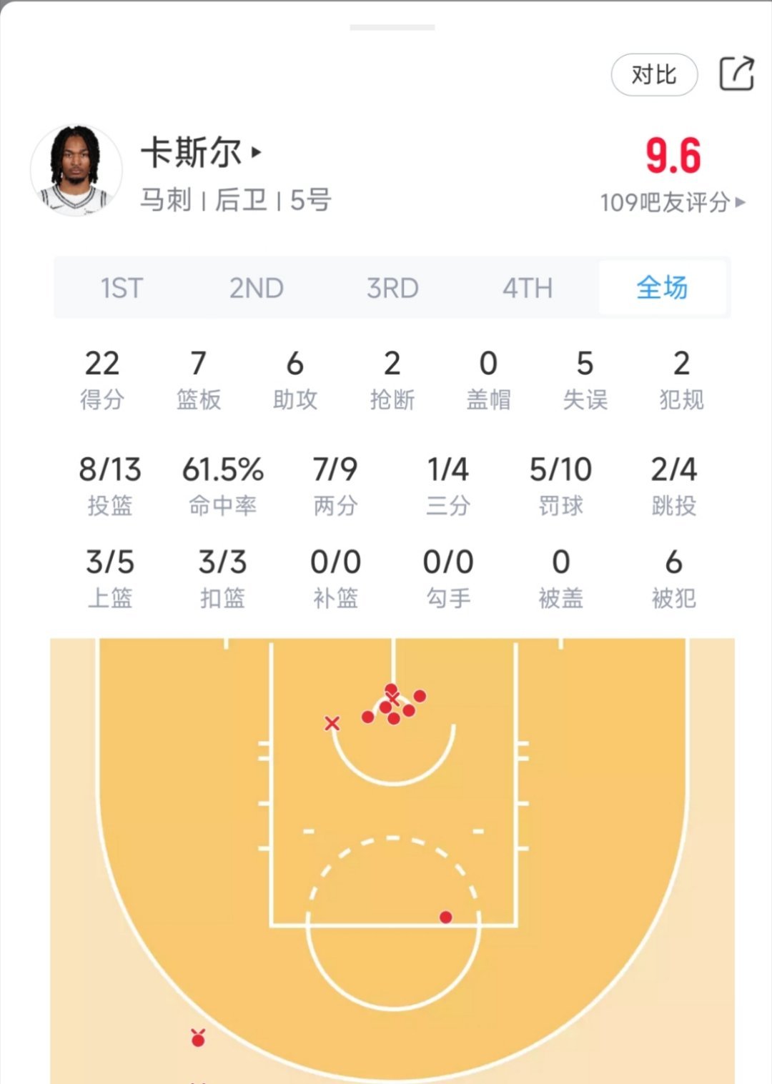 卡斯尔今日对阵独行侠拿到22分7篮板6助攻2抢断!