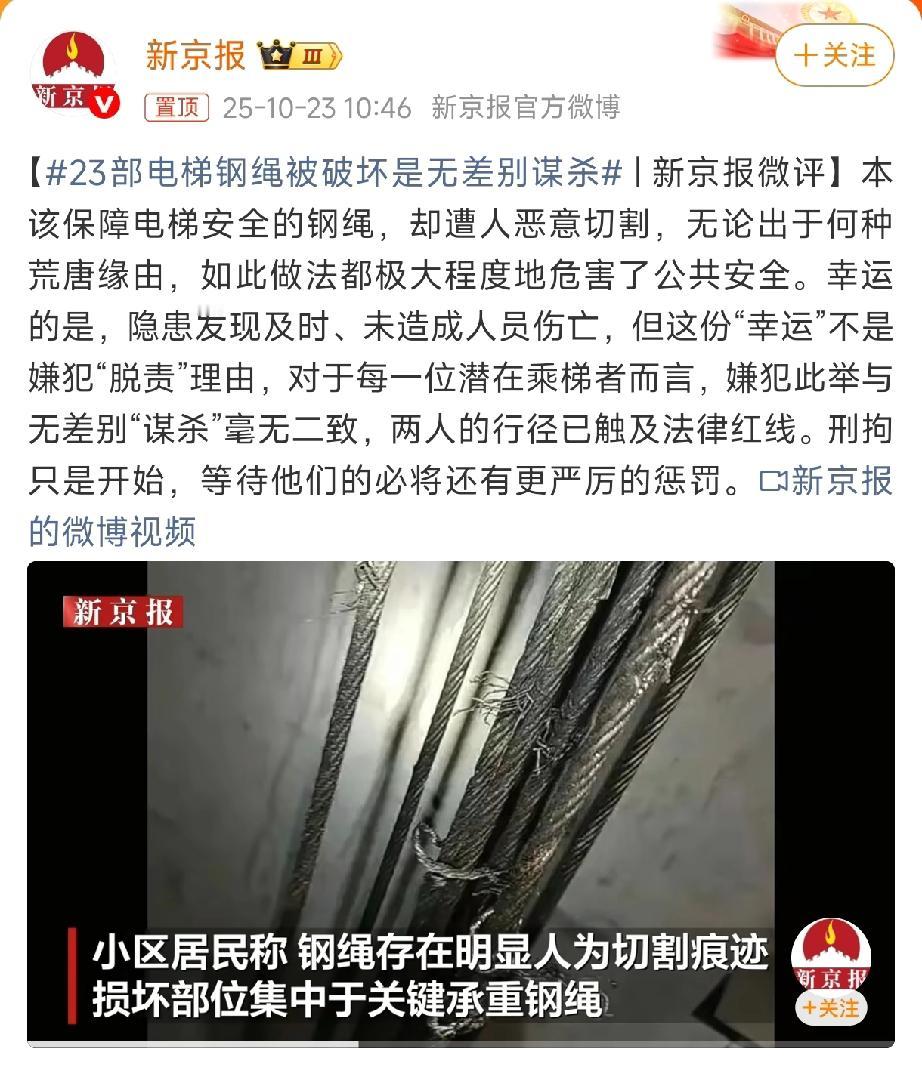 真是细思极恐!呼和浩特一个小区里,23部电梯的承重钢绳被人用专业工具精准切割,切口深达三分之一。要不是检修师傅多看了一眼,后果简直不敢想。 这事儿发生在10月21日,两名嫌疑人已经被抓了。他们不仅懂电梯结构,还躲过了监控,专挑钢绳最要害的地方下手。 法律上这算危害公共安全罪,说白了就是拿整栋楼居民的生命当儿戏。 虽然这次侥幸没出事,但暴露的问题一点不少:机房没监控、物业巡检有漏洞、全靠人工排查风险。 很多人爬了几天二三十层的楼梯,后怕是真的,愤怒也是真的。 说到底,安全不能总指望“运气好”。该装监控装监控,该严查严查,还得让街坊邻居都留个心。别等出事了再补救,生命的底线,一步都不能退。