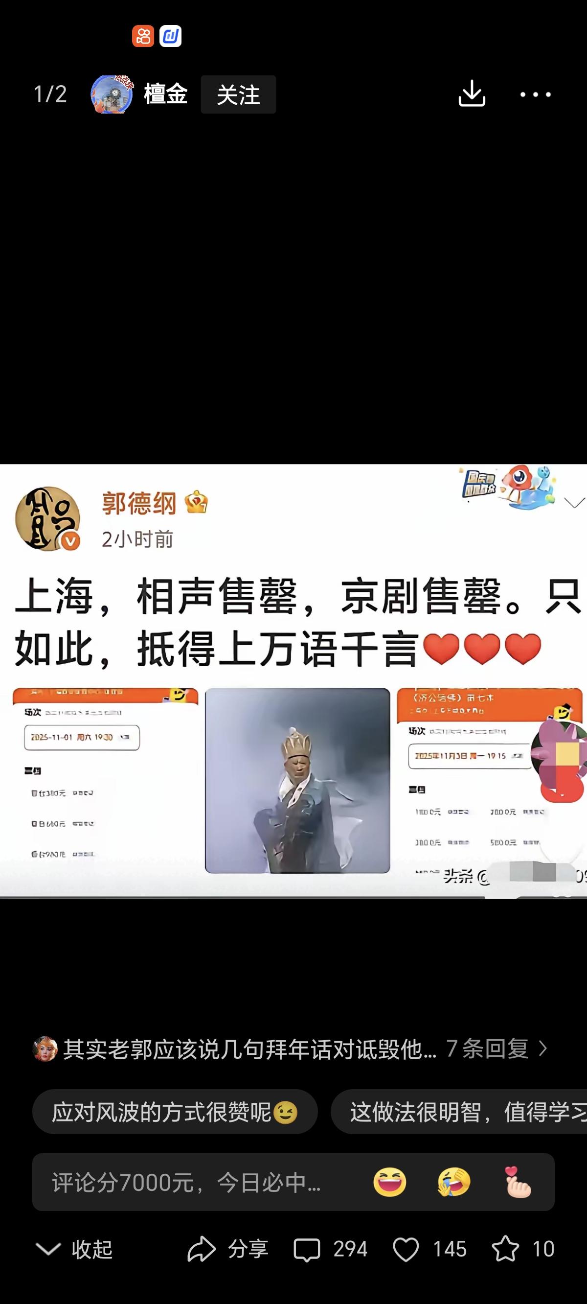 郭德纲狠打脸“三不沾”质疑!不辩解不回怼,一张售罄图让批评者哑火 “双包会”风波刚起,杨议一句“三不沾”(拉弦不沾打鼓、打鼓不沾唱戏)吐槽郭德纲京剧表演脱节,瞬间把老郭推上风口,业内嘲讽、网友调侃铺天盖地。可他既不辩解也不回怼,反手一条微博直接“封神”——“上海,相声售罄,京剧售罄”,配着居中的剧照,没有多余废话,却比万语千言更有杀伤力。 要知道,上海两场演出都是八千座位,开票即秒空,黄牛加价两百都抢不到票,年轻观众占比超半数。此前质疑他“糟改京剧”“票友水平”的声音,在实打实的票房数据面前彻底没了底气。老郭这招太绝,不跟你掰扯艺术争议,只用“老百姓愿意捧”的现实说话,任你风言风语,他自巍然不动。 群众基础杠杠的,再黑也没用!这一巴掌是不是打得相当漂亮?评论区聊聊~郭德纲收入 曹云金票价争议 郭德纲磨腕 郭德纲京剧 郭德纲出场费 郭德纲谣言 街角时光