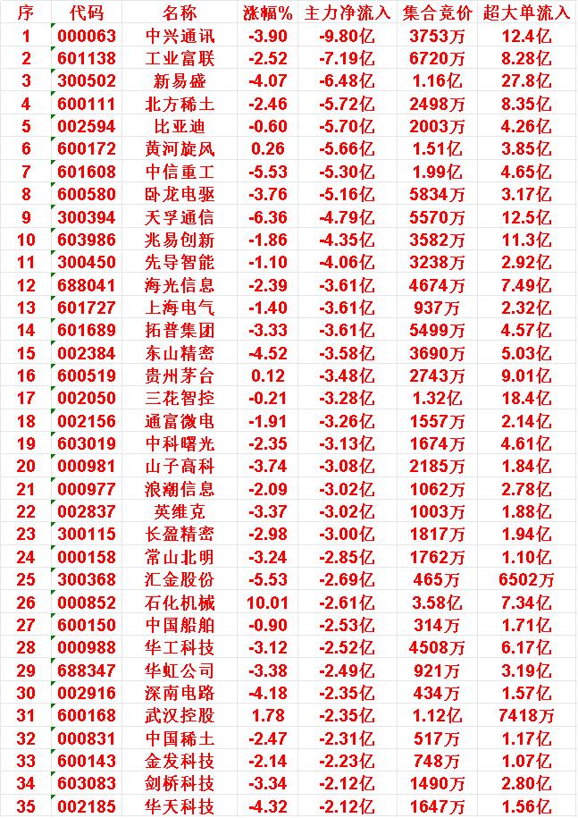 10月23日尾盘30分钟,主力资金大幅卖出的35名单! 中兴通讯:净流出 9.80亿元,集合竞价成交 3753万元; 工业富联:净流出 7.19亿元,集合竞价成交 6720万元; 新易盛:净流出 6.48亿元,集合竞价成交 1.16亿元; 北方稀土:净流出 5.72亿元,集合竞价成交 2498万元; 比亚迪:净流出 5.70亿元,集合竞价成交 2003万元。