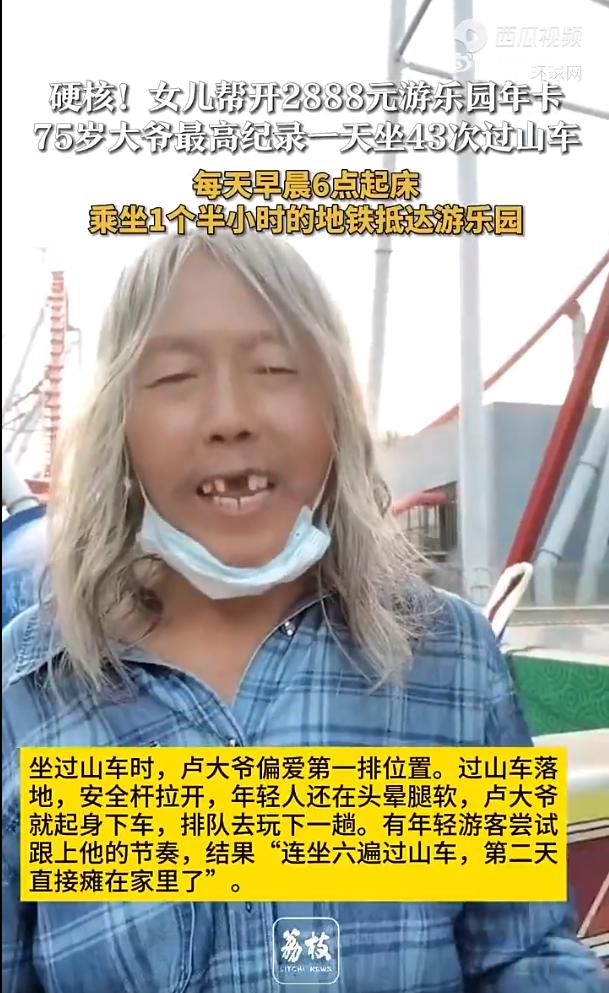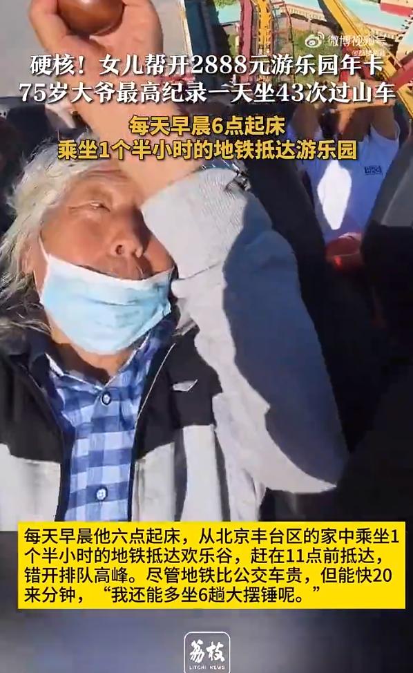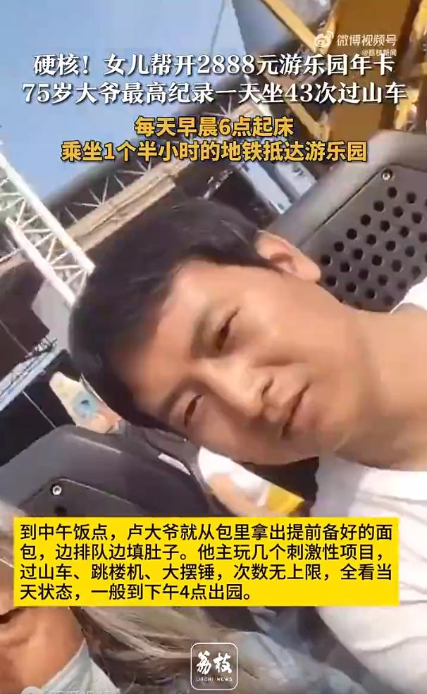 北京,女儿帮75岁父亲办了张游乐园年卡,没想到大爷非常喜欢玩,有时一天狂刷43次过山车,还专挑有刺激性的游戏玩。玩完后还能做到步履轻盈,很多年轻人都自愧不如!网友:大爷已经变成NPC了!   北京欢乐谷的清晨六点半,不少游乐设施还没完全运转,75岁的卢大爷已经背着布包站在门口等候。   这个头发花白却腰板笔直的老人,如今是园里小有名气的“硬核玩家”,而他每天雷打不动来打卡,起初是为了治病,后来渐渐成了最开心的生活日常。   卢大爷丧偶多年,退休后总觉得浑身不得劲,精神头也差。   女儿带他去医院检查,医生说适当运动能改善状态,偶然一次带他来欢乐谷尝试刺激项目,没想到大爷坐完过山车,反倒觉得浑身舒畅。   考虑到自己工作忙,陪父亲时间少,又听说父亲童年没见过现代乐园,女儿干脆花2888元办了张年卡,让父亲能随时来散心。   从那以后,卢大爷就成了欢乐谷的常客,他专挑过山车、大摆锤这些刺激项目玩,坐过山车必选第一排,用他的话说“视野开阔,劲儿最足”。   有次节假日人多,他提前揣着面包,边排队边吃,一天下来竟刷了43次过山车,落地后步履轻盈,让旁边腿软的年轻人直竖大拇指。   玩了一段时间,卢大爷的身体状态明显好转,以前总犯的腰酸背痛减轻了不少,精神也越来越足。   他说自己不是瞎玩,每次都会提前热身,感觉不舒服就立刻停下,十年前就喜欢这类项目,现在坚持下来,身体反倒比以前结实。   园里的工作人员都认识他,有时会提醒他歇会儿,他总笑着摆手说“再玩一次就歇”。   身边不少老人佩服卢大爷的劲头,也有人担心太危险。   医生后来也特意提醒,卢大爷的情况是个案,他本身身体素质不错,又有长期坚持的基础,其他人可不能盲目效仿。   但这并不妨碍大家羡慕他的退休生活,毕竟在很多人印象里,老人晚年不是含饴弄孙就是居家静养,像他这样肆意享受爱好的太少了。   卢大爷的日常里,藏着不一样的老年活力。   这种活力不是刻意追求刺激,而是找到能让自己身心愉悦的事并坚持下去。   他玩刺激项目时的专注,排队时的耐心,结束后脸上的笑容,都透着对生活的热爱。   儿看着父亲每天精神饱满地出门,回来兴致勃勃地讲园里的事,也打心底里高兴,觉得这张年卡办得太值了。   如今每天早上,欢乐谷门口总能看到卢大爷的身影。   他还是会直奔过山车,还是喜欢坐第一排,落地后和年轻人聊上几句。   对他来说,这里不只是游乐园,更是治愈身心的地方,而这份把日子过热闹的劲头,正是最动人的晚年模样。