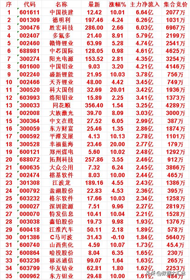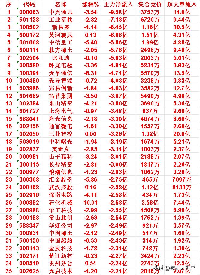 10月23日收盘,主力趁冲高,已经大幅卖出的35名单: 中兴通讯:主力净流出 9.58亿元 工业富联:主力净流出 7.18亿元 新易盛:主力净流出 6.45亿元 黄河旋风:主力净流出 6.08亿元 中信重工:主力净流出 5.86亿元 北方稀土:主力净流出 5.76亿元 比亚迪:主力净流出 5.63亿元 卧龙电驱:主力净流出 4.81亿元 天孚通信:主力净流出 4.71亿元 先导智能:主力净流出 4.03亿元 兆易创新:主力净流出 4.03亿元 10月23日中午收盘,主力资金“大幅买入”的35强: 601611 中国核建:主力净流入 6.64亿元 001309 德明利:主力净流入 6.26亿元 300476 胜宏科技:主力净流入 6.03亿元 002407 多氟多:主力净流入 5.79亿元 002460 赣锋锂业:主力净流入 4.74亿元 688981 中芯国际:主力净流入 4.61亿元 300274 阳光电源:主力净流入 4.35亿元 601600 中国铝业:主力净流入 4.21亿元 002240 盛新锂能:主力净流入 3.78亿元 002466 天齐锂业:主力净流入 3.45亿元 300520 科大国创:主力净流入 3.42亿元