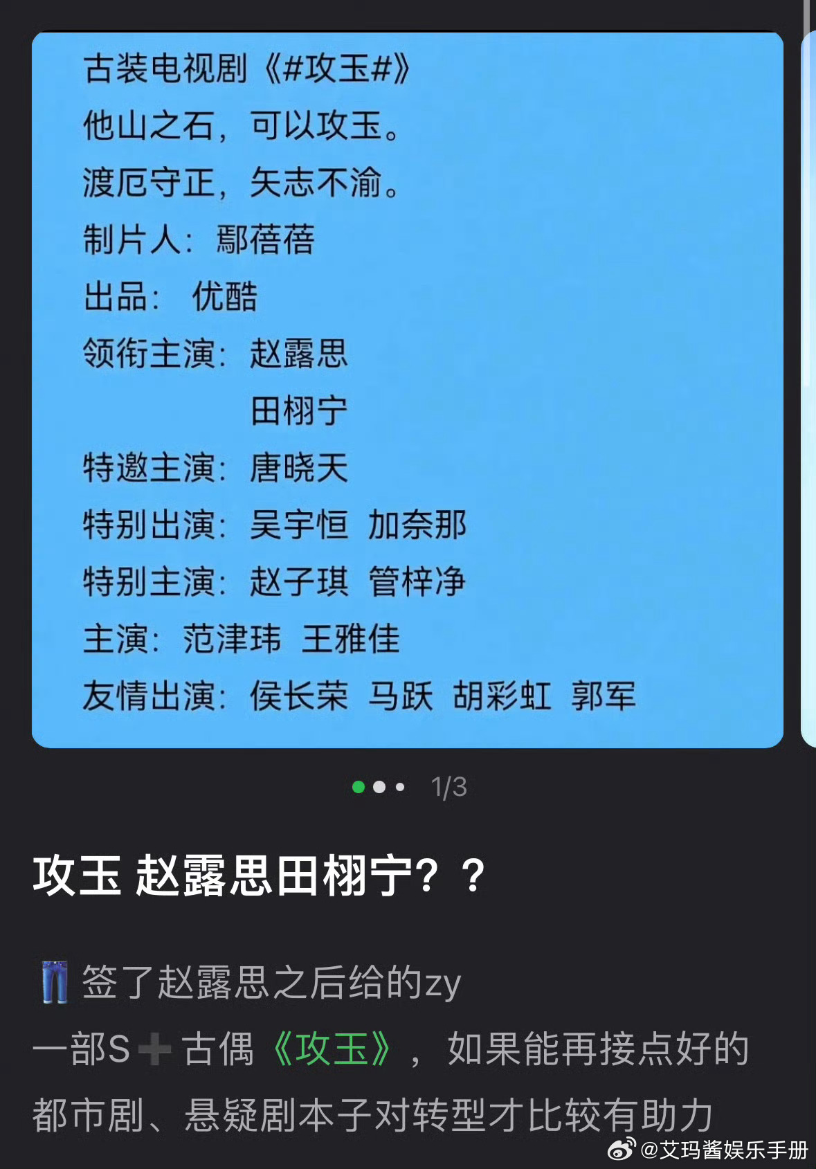 🍉网传《攻玉》主演赵露思 田栩宁,你期待吗?