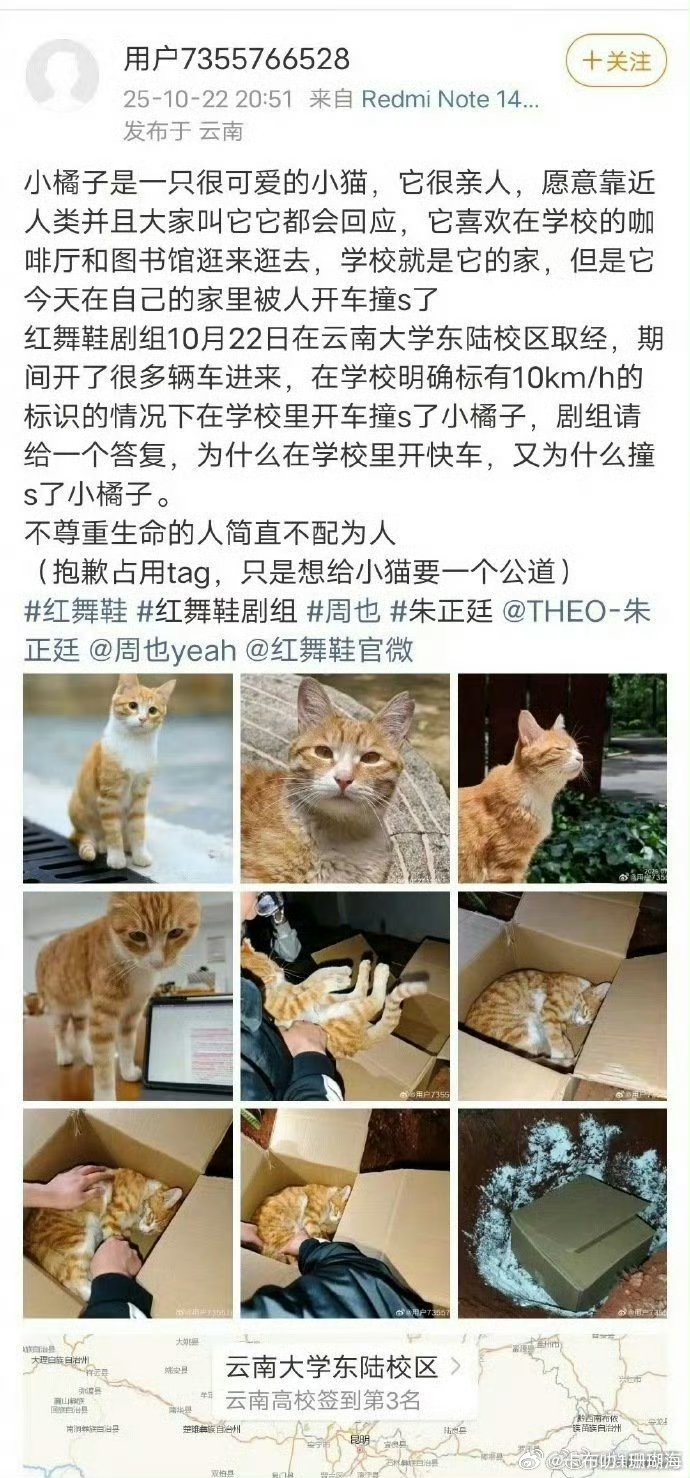 《红舞鞋》真是未播先火啊!当初放出周也在剧组锻炼得痛哭引发热议,如今又在步行道撞死了云大师生共养的小猫。到底是剧组拉设备的司机,还是演员的司机呢?为什么剧组的车不是在正常线路行驶,而是开上了步行道呢?再次引发网友热议……