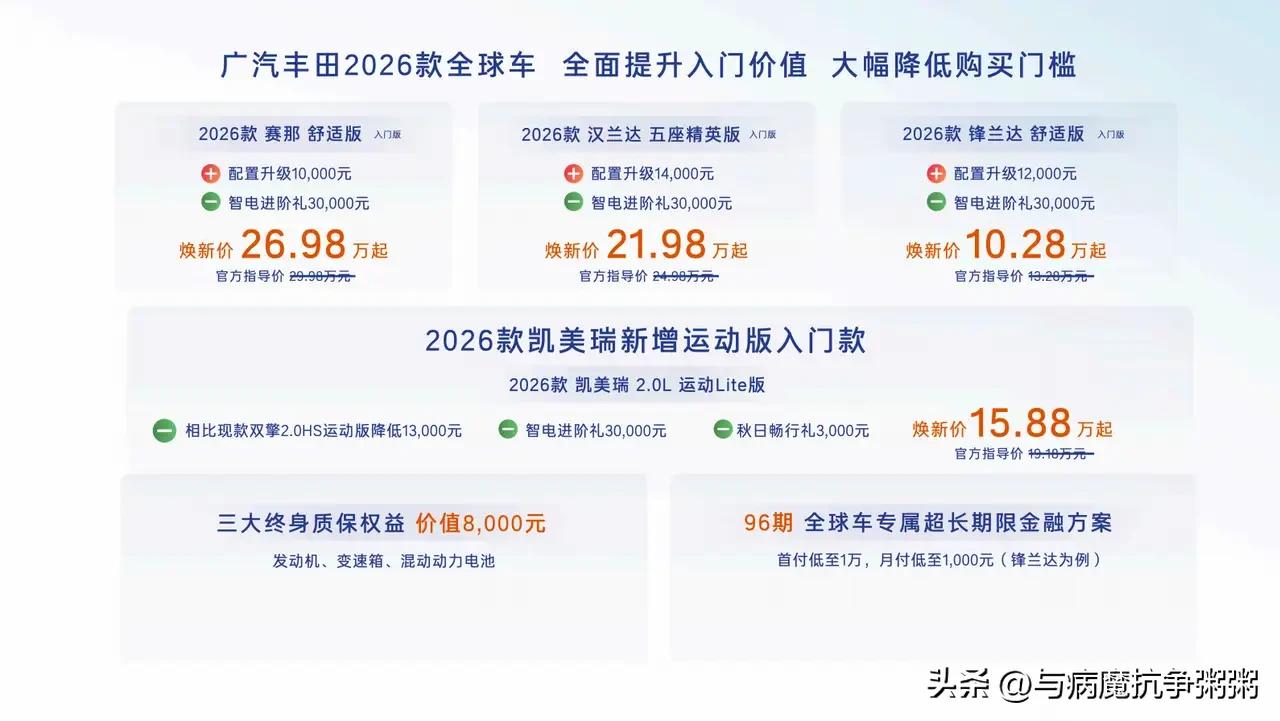 2025年上半年全球车企销量前五名: 第一、丰田424.44万辆; 第二、大众239.09万辆; 第三、福特194.52万辆; 第四、现代171.47万辆; 第五:本田 168.80万辆; 丰田品牌已连续五年稳居全球销冠! 广汽丰田2026款新车上市 26款凯美瑞全方位升级,续写传奇篇章 先说说动力,这可是一辆车的核心所在。26款凯美瑞延续了2.0L燃油版、2.0L双擎和2.5L双擎三个段位的动力系统。这就好比为消费者准备了一场丰盛的动力盛宴,不同口味的“食客”都能在这里找到满足自己需求的“佳肴”。如果你追求纯粹的驾驶乐趣和强劲的动力输出,2.0L燃油版或许会是你的不二之选;要是你更注重节能环保和燃油经济性,2.0L双擎和2.5L双擎则能让你在享受驾驶的同时,为环保贡献一份力量。丰富的动力选择,让每一位消费者都能根据自己的实际情况和喜好,挑选到最适合自己的凯美瑞。 再看看外观,这次的升级堪称是一场视觉上的“重生”。新车延续了现款车型的设计风格,同时又进行了大胆的创新。前脸一体式蜂窝网状进气格栅搭配C字型前大灯,就像给凯美瑞换上了一张充满个性和活力的“新面孔”。蜂窝网状进气格栅犹如蜂巢一般,精致而又富有层次感,不仅增加了车辆的运动感,还提升了进气效率;C字型前大灯则像是一双锐利的眼睛,在夜晚闪烁着独特的光芒,让凯美瑞在车流中脱颖而出,极具辨识度。 车身侧面的设计同样令人眼前一亮。造型运动流畅,腰线采用贯通式设计,从车头一直延伸到车尾,仿佛一条灵动的线条在车身表面舞动。这种设计不仅让车辆看起来更加修长和优雅,还增强了车身的整体感和力量感。当你站在车旁,一眼望去,就能感受到凯美瑞那扑面而来的运动气息。 除了动力和外观的升级,26款凯美瑞在科技配置和安全性能方面也有了显著的提升。丰富的科技配置让驾驶变得更加轻松和便捷,例如智能互联系统、自动驾驶辅助功能等,让你在旅途中享受更多的乐趣和便利。而出色的安全性能则为你和家人的出行保驾护航,无论是主动安全系统还是被动安全配置,都达到了行业领先水平。 26款凯美瑞以其更具冲击力的外观、更强劲的动力、更丰富的科技配置和更出色的安全性能,再次证明了它在中级轿车市场的王者地位