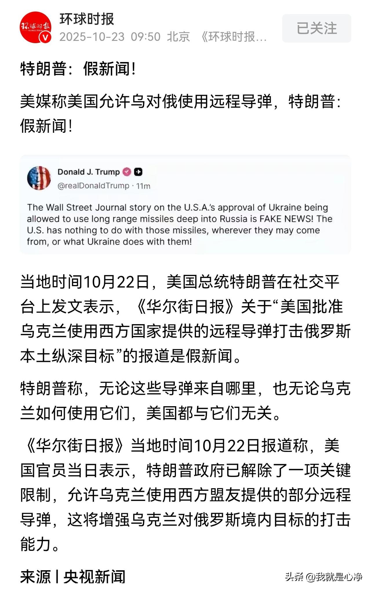 特朗普这个人说话颠三倒四总是自己否定自己。他的这个特点就很容易被故意做文章。 针对他的各种谣言也就越来越多了。 美国当地时间22号,特朗普在他的社交平台上发文称。 华尔街日报最新的一篇文章完全就是假消息。 华尔街日报当天有报道称,特朗普批准乌克兰使用西方国家提供的远程导弹,打击俄罗斯本土纵深目标。 就是这篇报道被特朗普认定为虚假消息。 现在围绕特朗普的所有消息,我们已经不敢全信了,但是你还不能一点都不信。 特朗普自己经常放假消息,西方媒体经常借特朗普的名义制造假消息。 现在心净高度怀疑,取消和普京的会面,这条消息也有一定的水分。 很有可能明天一早就会来新的新闻。 特朗普否认了今天的传言,他跟普京还是要会面。 这种可能性不是没有,在特朗普身上一切皆有可能。 说真的,不排除特朗普故意迷惑一下欧洲国家的领导人。 然后来一场突袭一样的外交访问。