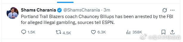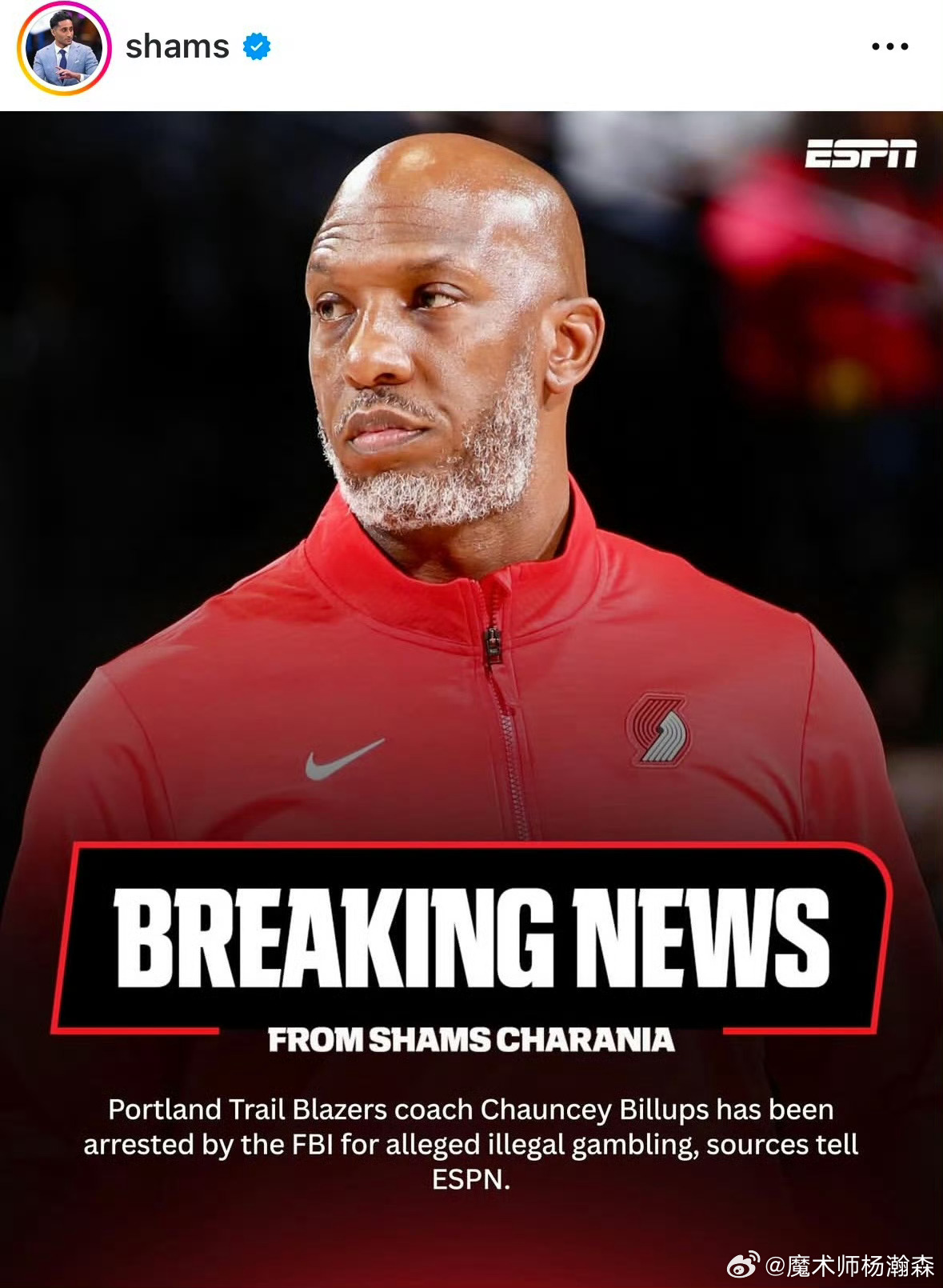 Shams:波特兰开拓者队主教练昌西·比卢普斯因涉嫌非法赌博,已被联邦调查局(FBI)逮捕。 杨瀚森常规赛首秀
