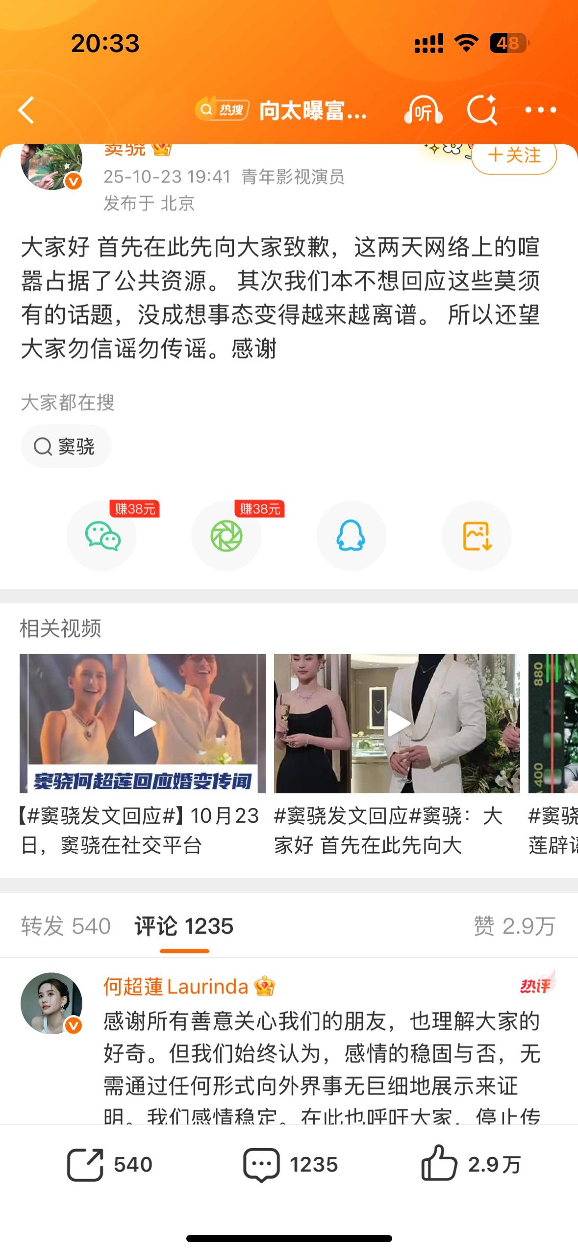 窦骁何超莲回应了 向太也就差指名道姓了,而且因为她的话,产生那么大场闹剧她也没出来帮人澄清,还点赞人家婚变的帖子 本来突然开始说他们俩就挺奇怪的。。。人家工作去了说是消失的爱人,人家参加了家庭活动又要说人家吃 软 饭。不发照片没诚意,发了照片说身体语言不恩爱,眼里没光。发两口子抱在一起的照片,说只知道秀恩爱没事业心。怎么就看不得人家家庭幸福啊