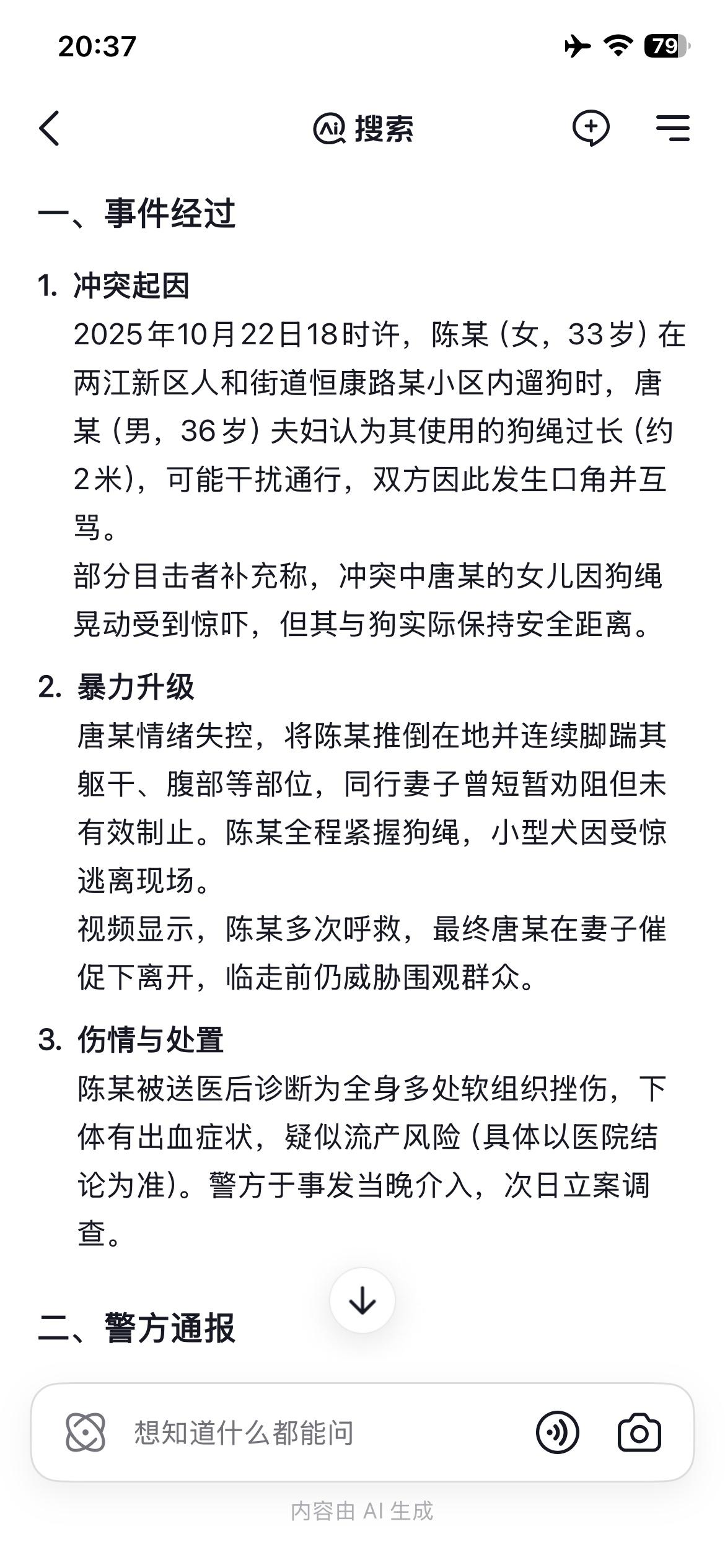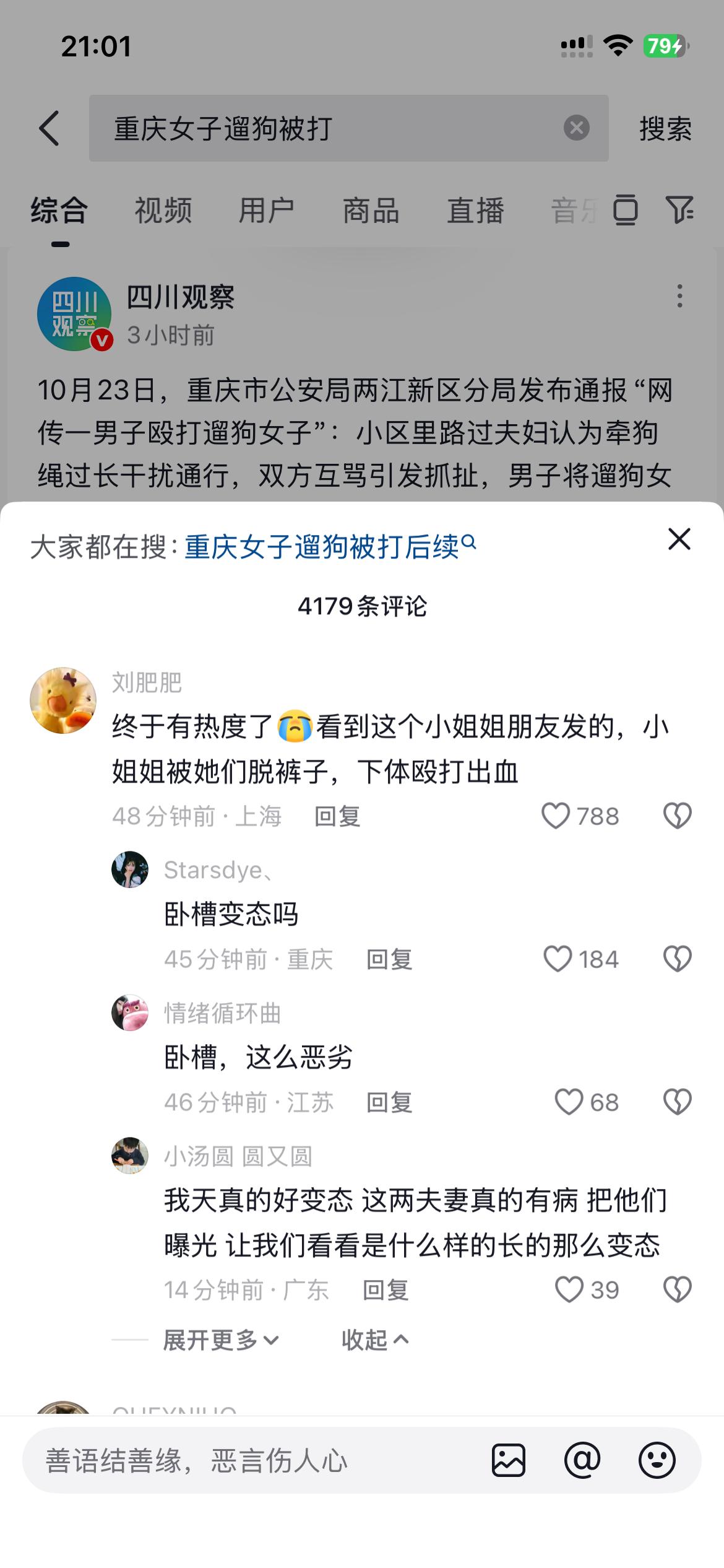遛狗女被男子殴打事件上热点了。男的下手确实太狠了。网上路人评论说差点被扒裤子(但看不到该描述的视频细节),不知真假。 正义溢价过度,还是正义吗? 从网传视频看:狗主有带绳遛狗,只因狗绳过长妨碍了通行,起了口角,就活该被殴打吗?狗主被殴打期间,仍没松开狗绳,狗狗也不像大型烈性犬,不至于受到如此暴力。 违规遛狗可以谴责,但不能把养狗遛狗无限妖魔化,更不能暴力殴打他人。这种无上限做法不应该提倡。