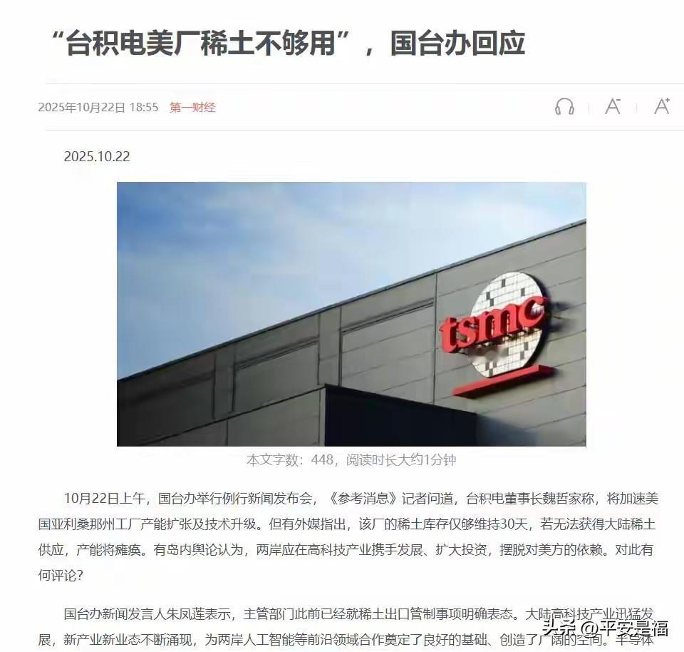 台积电:我们已经顾不上美国工厂了,大陆再不给稀土,大家都得完 台积电:我们已经顾不上美国工厂了,大陆再不给稀土,大家都得完 这话听着像急眼了的哀嚎,细品却全是现实给的耳光。就在几天前的国台办发布会上,一句关于台积电美国工厂稀土库存仅够撑30天的提问,直接把这场供应链危机摆到了台面上,而台办那句“主管部门此前已明确表态”的回应,更像给这场焦灼加了把沉默的火。 谁能想到,手握全球先进芯片产能的行业巨头,会被小小的稀土卡了脖子?可数据不会说谎,台湾省每年96%的稀土都从大陆进口,台积电自己一年就要烧掉3000吨,库存撑不过一个月的说法绝非危言耸听。更狠的是大陆刚出台的“0.1%规则”,只要境外产品里大陆受控稀土成分超0.1%,再出口就得拿许可,这等于直接捏住了台积电先进制程的命门——要知道它的5纳米芯片里镧元素含量就有0.5%,早踩过红线了。 有人说台积电不是在美建厂吗?那不过是看上去热闹。原本计划2024年投产的美国工厂,因为缺技工、成本飙涨,硬生生拖到2025年才勉强量产4纳米芯片,3纳米生产线更是要推迟到2027年以后。对比下日本熊本工厂20个月就完工的速度,美国工人8小时工作制的效率和三倍于亚洲的人工成本,早让那650亿美元的投资成了烫手山芋。 更讽刺的是台伪当局的反应,一边说稀土管制影响“不大”,一边又盼着美国来救场。可美国自己都是泥菩萨过江,80%的稀土依赖进口,75%来自大陆,本土矿提纯纯度连99.9%的门槛都达不到,重稀土技术更是落后我们近30年。拉上澳大利亚、日本搞的“去中国化”供应链,到最后还是得把矿石送回大陆加工,不过是自欺欺人。 台积电的困境从来不是简单的材料短缺,而是被绑上“倚美谋独”战车的必然结果。为了向美国输诚,硬着头皮把产能搬去美洲,却忘了自己的根早就扎在两岸供应链里。魏哲家自己都说“最先进制程一定先在台湾落地”,全球70%的高端芯片订单还攥在台湾工厂手里,这种“核心留台、外围赴美”的布局,本就经不起供应链的风吹草动。 稀土这张牌,打的是产业逻辑,戳的是政治投机。大陆握着全球90%以上的稀土精炼产能,从矿石到设备的全链条管制,根本不是短期能替代的。台积电喊“大家都得完”,不如说是在提醒那些沉迷地缘博弈的人:产业规律从来不会为政治偏见让路。 各位读者你们怎么看?欢迎在评论区讨论。美国稀土需求 美国稀土订单 美国稀土 美国稀土依赖 台积电 美国稀土国产化 台积电断芯