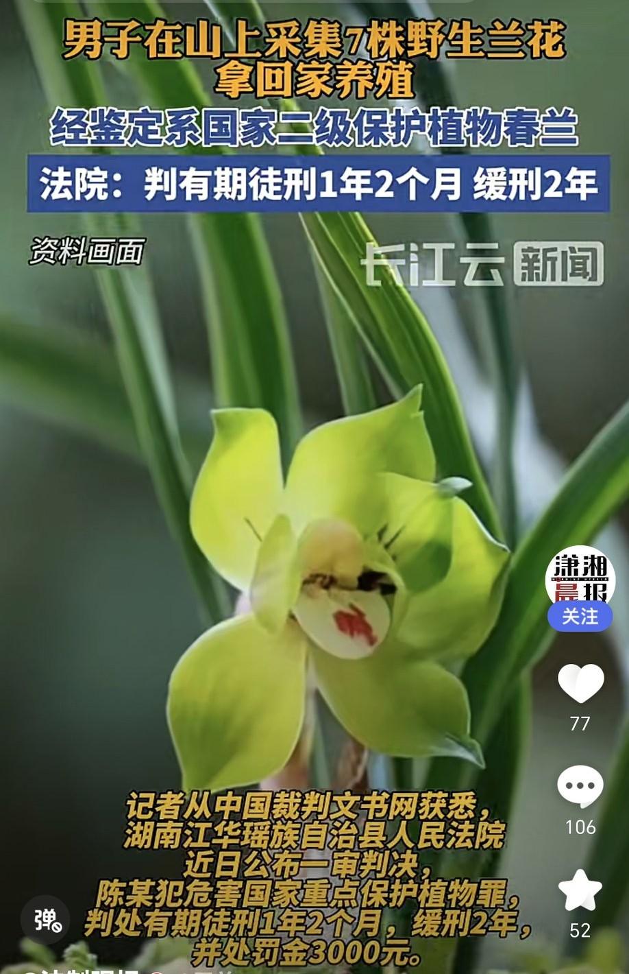 湖南江华瑶族自治县的陈某,因非法采挖7株野生兰花被判缓刑。2023年3月和5月,他两次在野外山场,未办理采集证就采了7株兰花回家分株栽种。经鉴定,这些兰花是国家二级保护植物春兰。法院判他有期徒刑1年2个月,缓刑2年,还罚款3000元。 A网友:建议专家去找到这些花草,然后给边上安个牌子写个说明。要不然普通人,谁知道这些是国家保护植物啊?再说了教育为主,他只是为了好看采回家,又不是为利益,罚的有点重了。 B网友:野生的不能挖吗?今天才知道不能挖,挖了就犯法。生活在山里或者挨着山住的人,真得注意,现在不是什么都能挖,都能带回家的。以前家那边的山里到处都是,好多人都挖回来养家里,现在竟然挖了要坐牢? C网友:大别山区的兰花都让野山羊吃完了,怎么办?一个是保护动物,一个是保护植物。专家们赶紧想想办法。 网友们说的对,我们在这方面的相关认知和普法教育还不够,毕竟大家都不是植物专家。相信不少人和我一样,原来都不知道,采挖野生兰花回家栽种是违法的。而且陈某也不是为了获利。这事儿也提醒当地要加强宣传,在山里小道入口立警示牌,让大家别因为无知犯法。希望能够普及相关知识,避免一不留神违法犯罪。