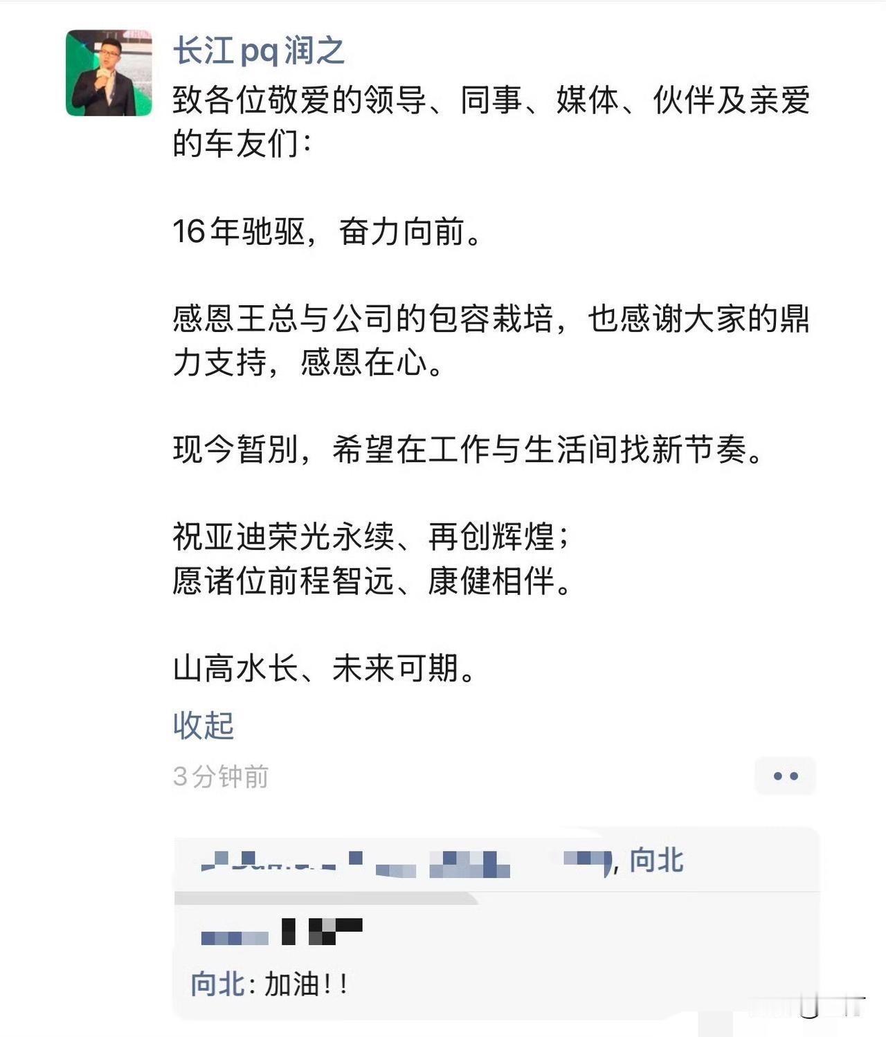 赵长江在朋友圈发文,告别比亚迪! 就在刚才,赵长江发了一半比较深情的文字在朋友圈,算是这么多年来对比亚迪的告别吧! 毕竟他在比亚迪干了16年,任何一个人在一个单位干了16年,感情都不是一般的深,而且这么多年以来,也可以算是相互成就吧,没有比亚迪就没有他,咱俩也是因为有了他才做出了一系列不错的产品! 尤其是这几年非常不错的腾势系列,但是从他的字里行间两个看得出来,他还是一个比较感恩的人,专门感谢了王传福,以及整个公司领导同事,还有各位媒体朋友,甚至这么多年以来各个公司,上下游产业链合作的伙伴。 但是他也没有说,自己接下来会干嘛,毕竟他说的是,自己会暂时的告别,来平衡工作和生活,估计他会休息一段时间吧。 就像他说的 ——山高水长、未来可期 祝福长江在新的领域发光发亮,一切顺利!