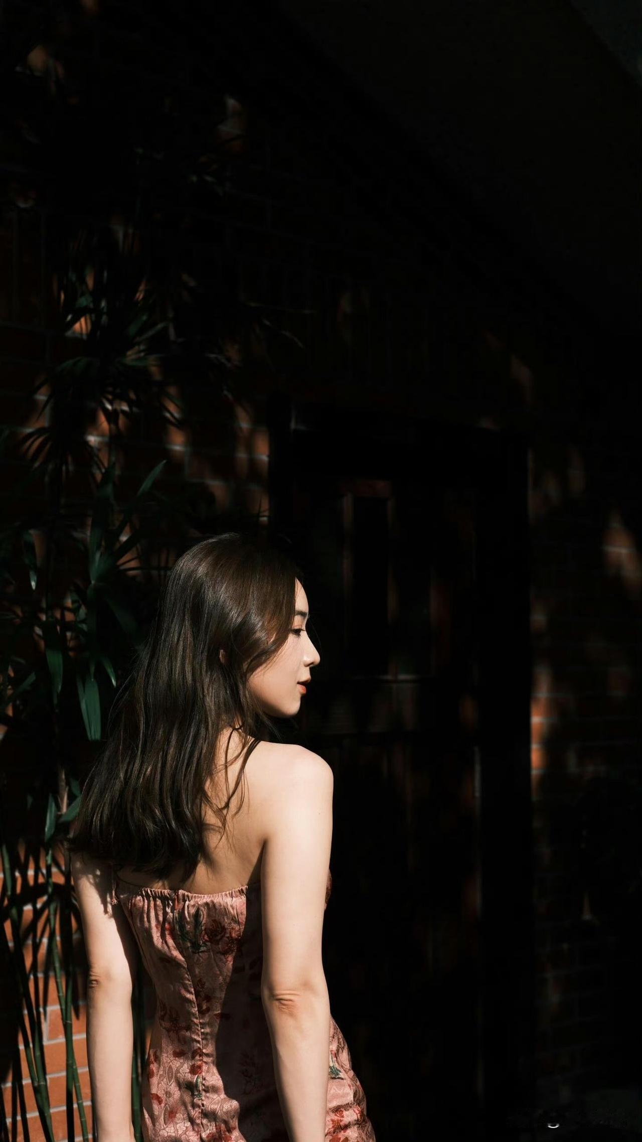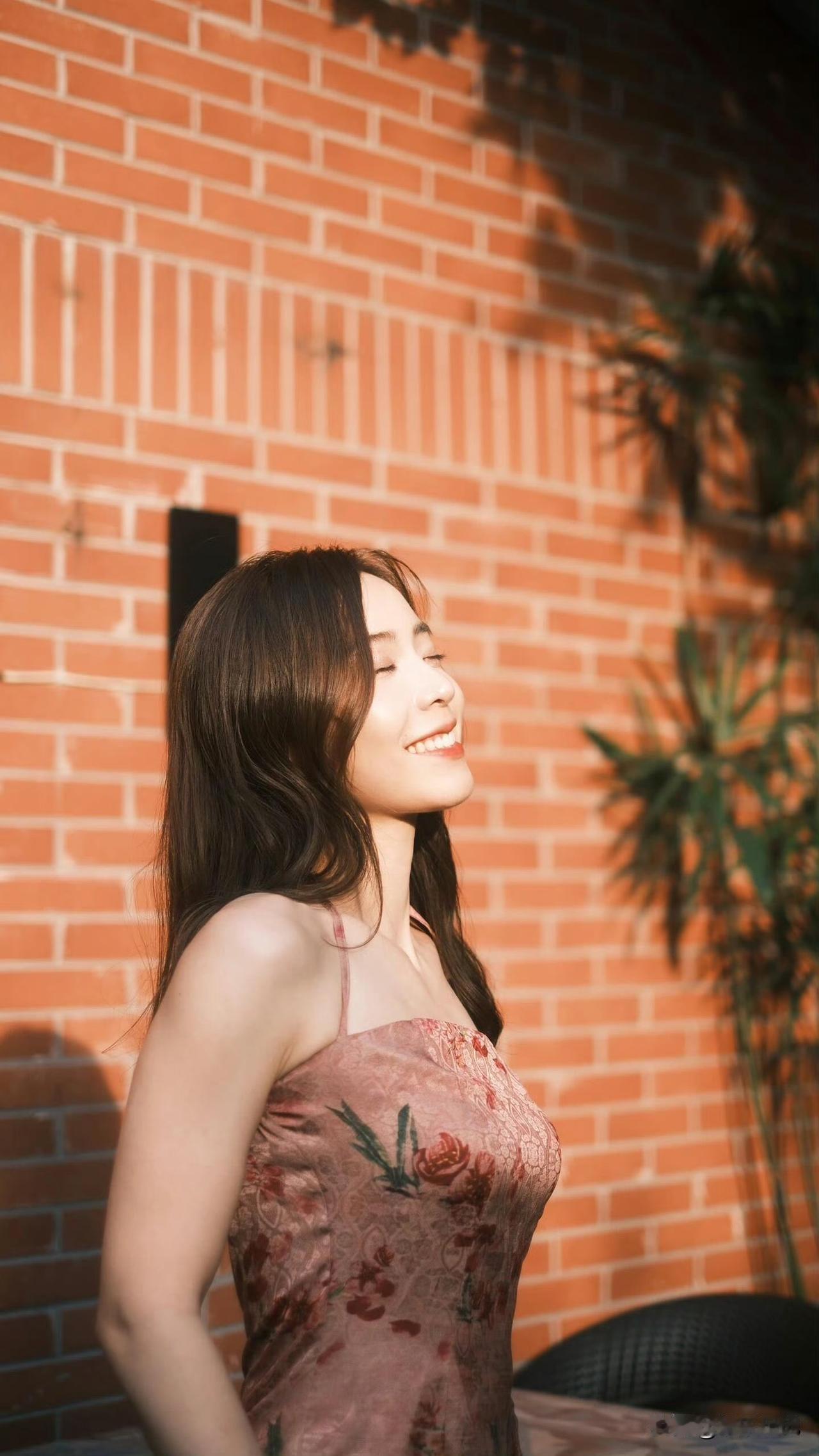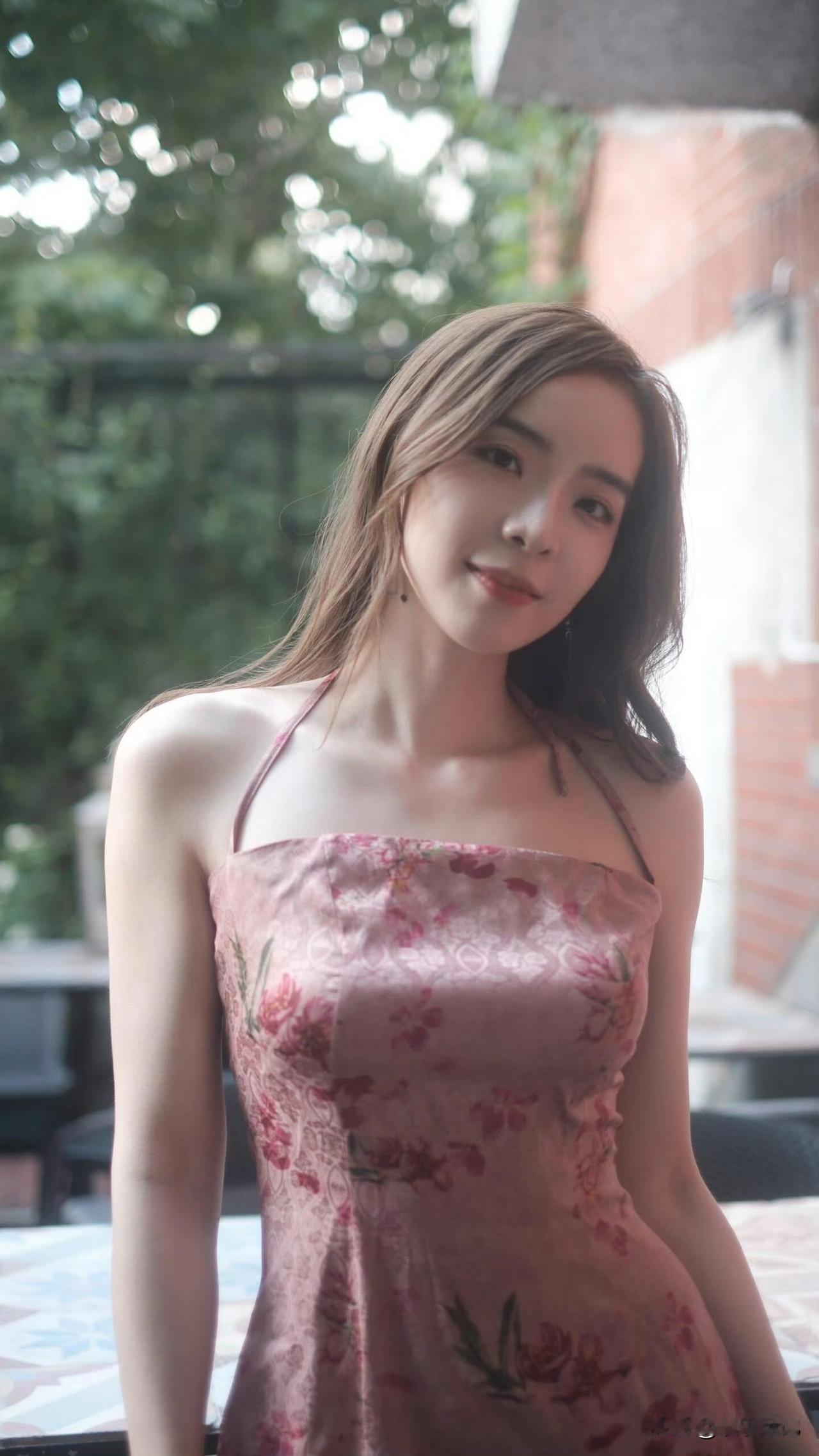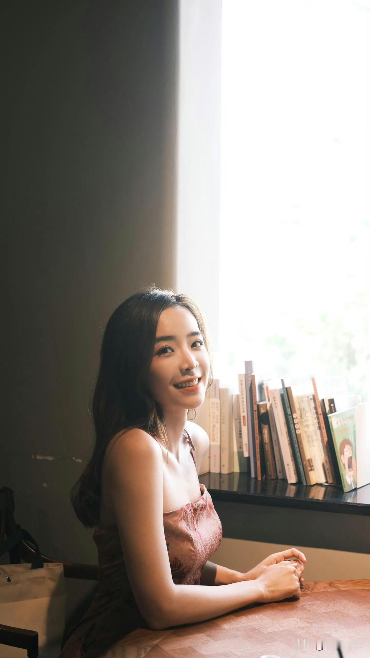 余霜,复古咖啡店拍照,一袭咖啡色吊带长裙,文艺氛围感满满