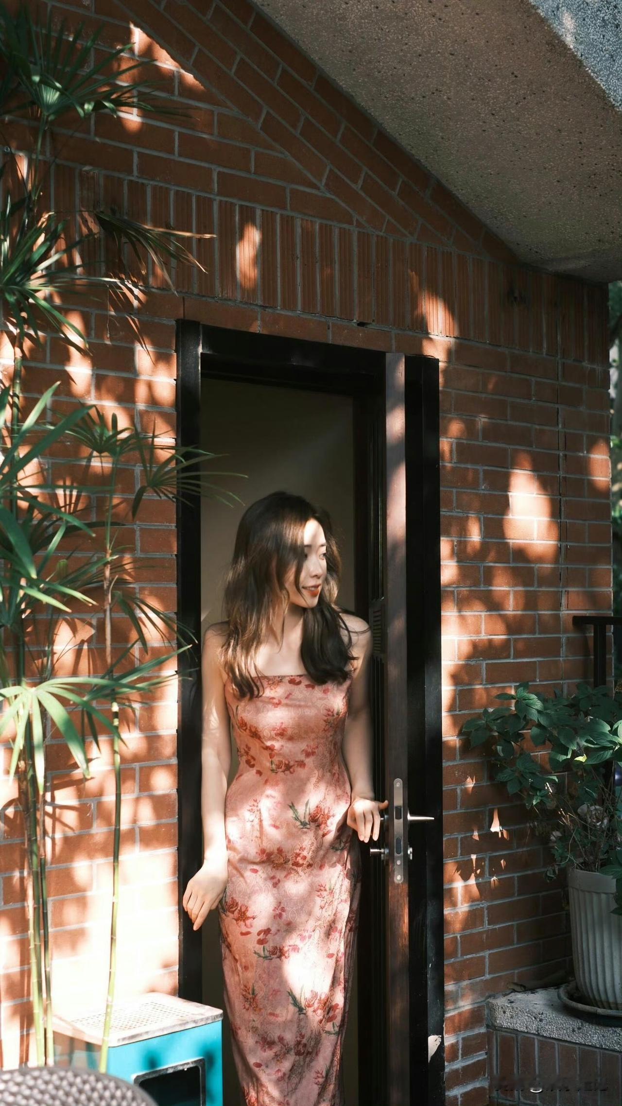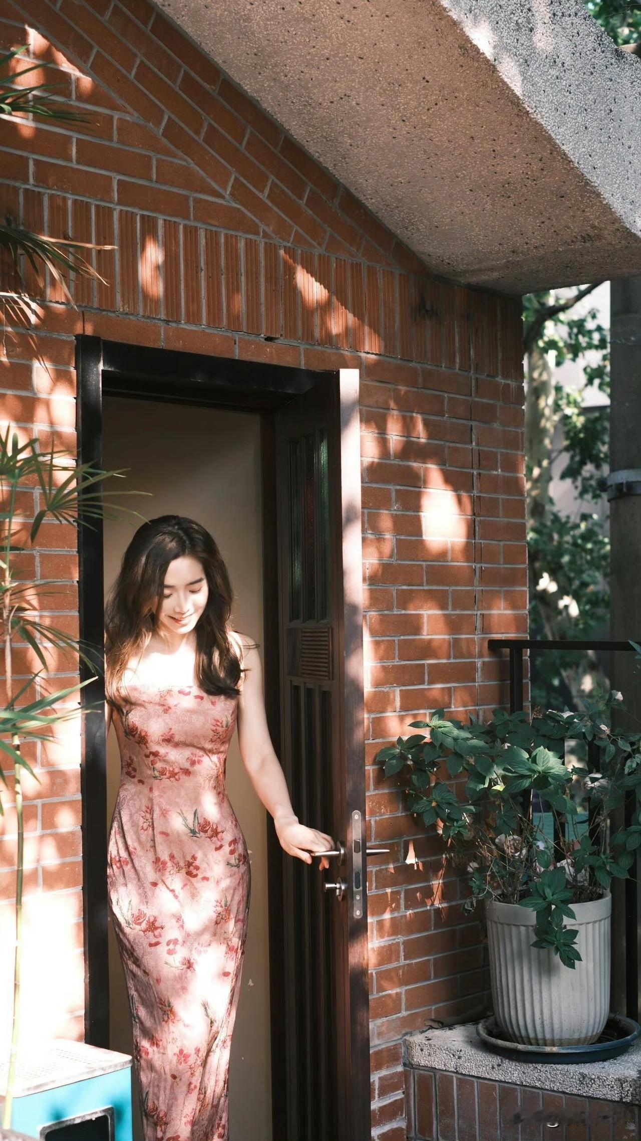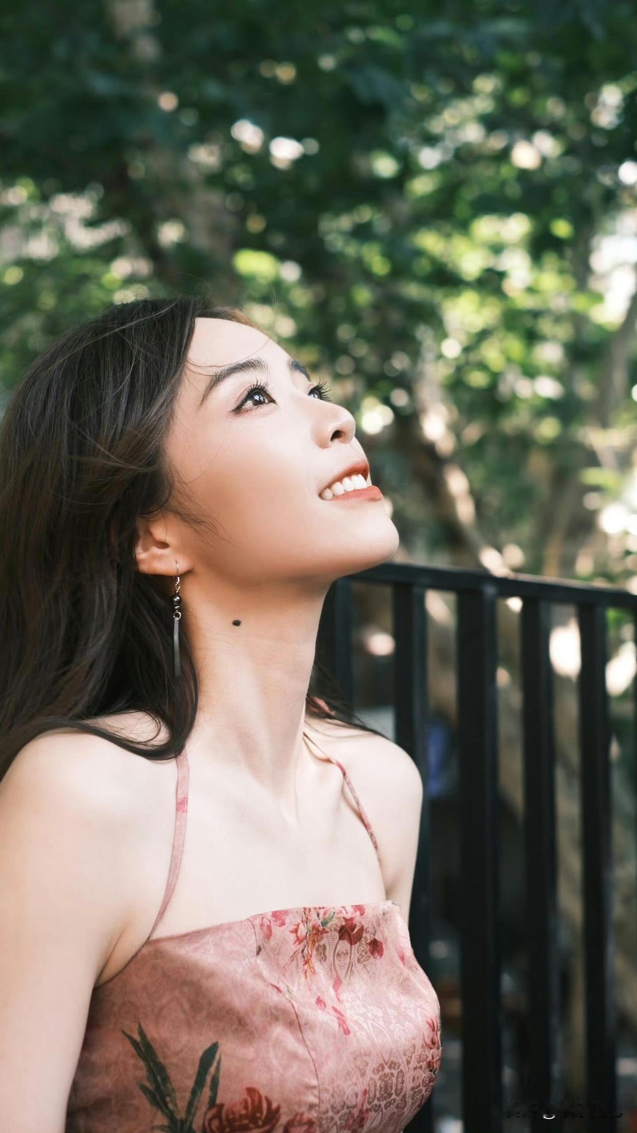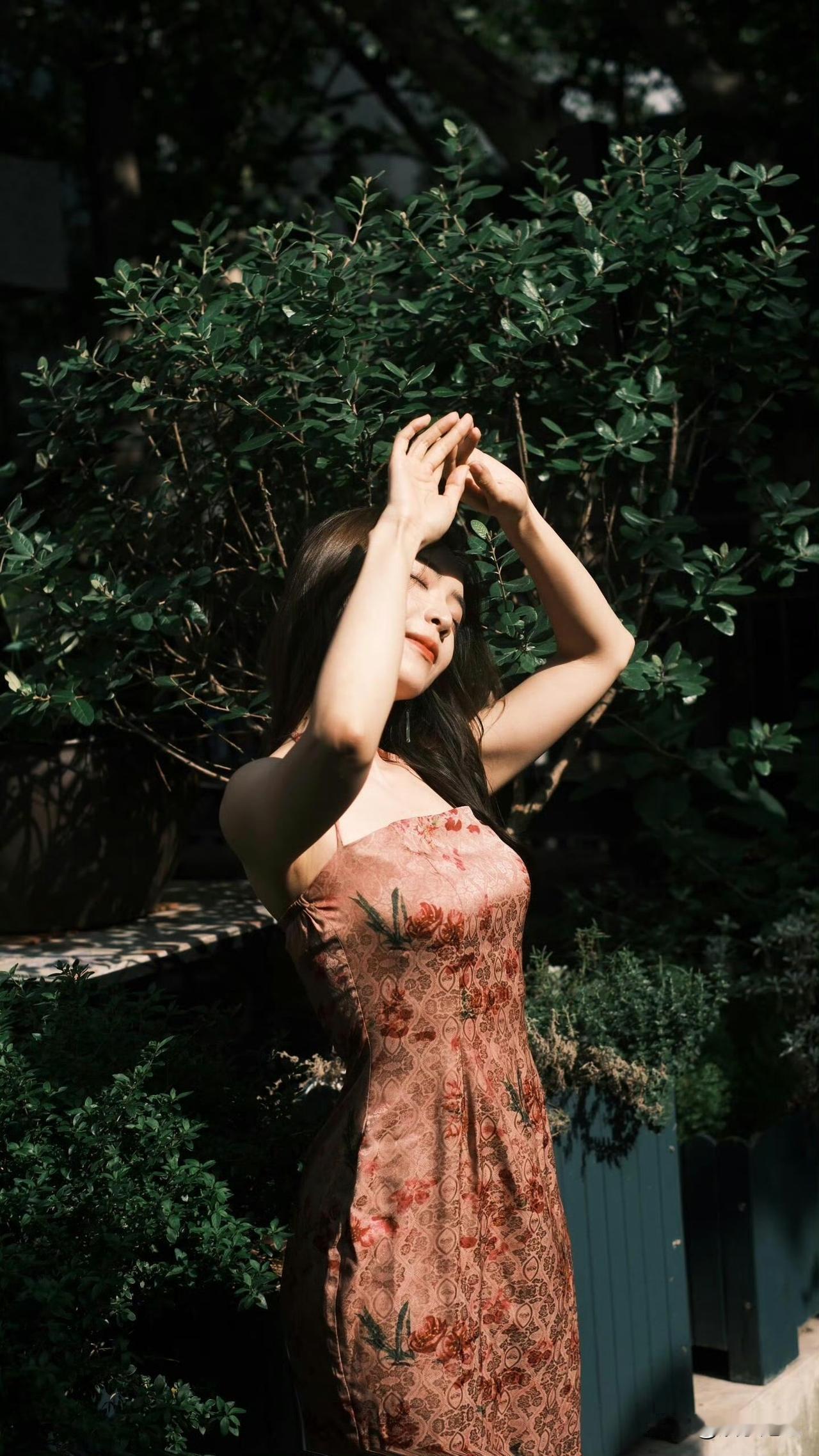 余霜,复古咖啡店拍照,一袭咖啡色吊带长裙,文艺氛围感满满