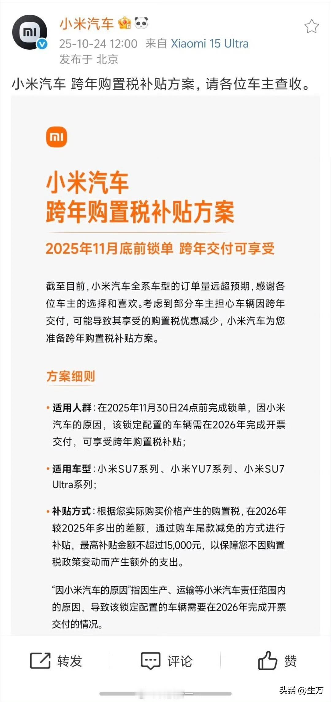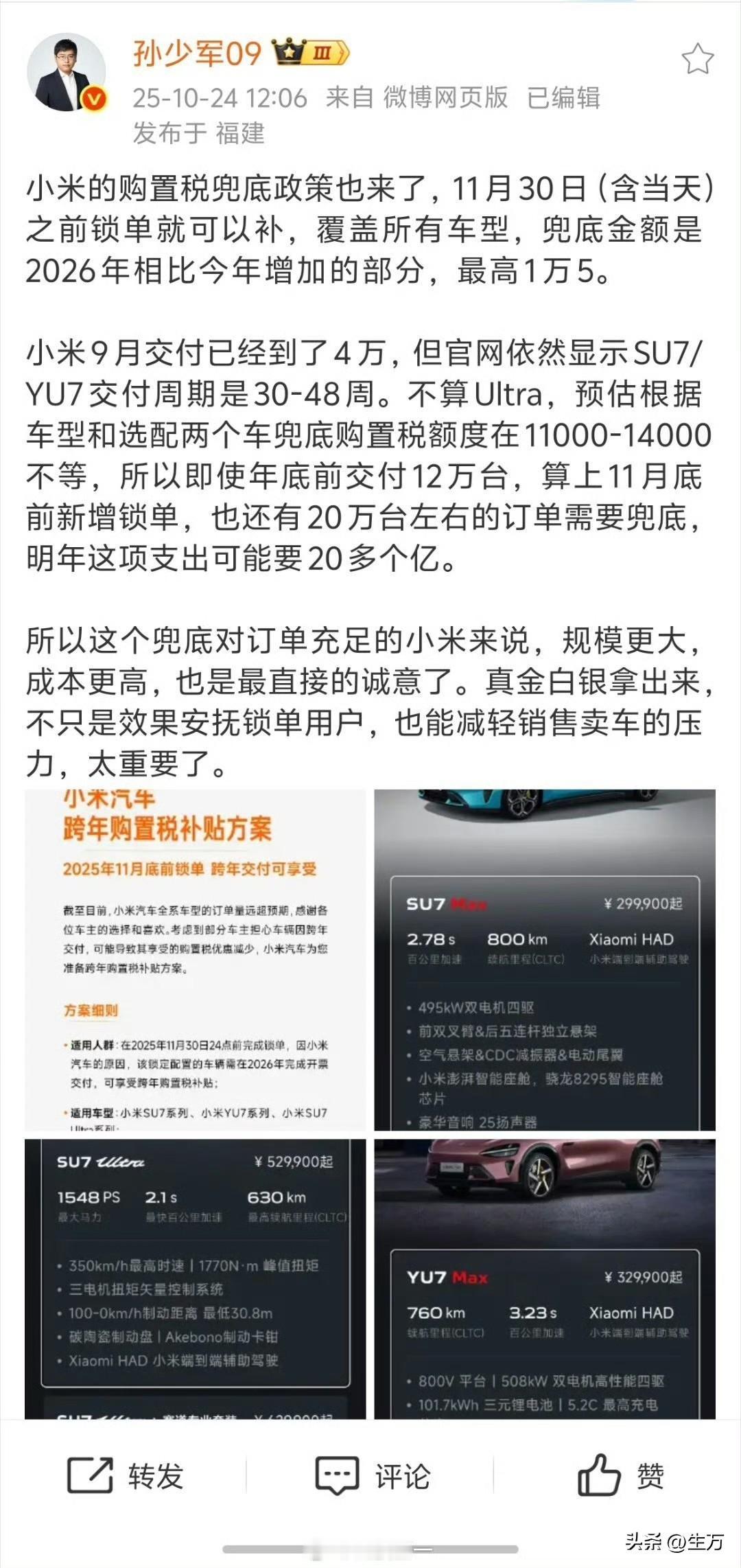 孙少军:小米购置税兜底,在这方面的花费达到了20亿! 就在刚才,孙少军在个人社交网络,转发的小米购置税兜底的这一个补贴方案,他给小米算了一笔账,他们这样做前前后后,花费达到了20亿。 本来一开始,他们是把这个方案定到10月底的,现在直接延续到下个月月底了! 也就是说,你只要在12月之前定小米汽车的,他们直接给你补贴了明年的购置税! 要知道,小米汽车目前不但不愁销量,还得排队,在这种情况下,他们还拿出真金白银来做补贴,孙少军说这方面支出要20亿! 看来小米是把卖手机的策略,用到了卖汽车上,不知道是否有人记得,好前几年,小米直接把第一代手机用户的1999元给退了! 不知道他们啥时候,会来一招当年一样的操作,比如某一天,他们汽车业务真的赚钱了,直接把前面1000位或者10,000位的汽车费用全部都给退了[捂脸][捂脸] 那可就大气了,但这种可能性是很小的,但也不是完全不可能[呲牙]