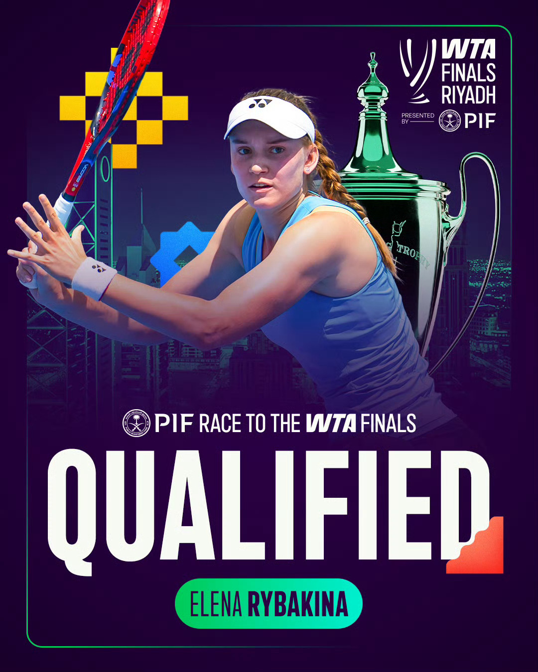 来自哈萨克斯坦的莱巴金娜将与PIF WTA世界第一萨巴伦卡、斯瓦泰克、卫冕冠军高芙、阿尼西莫娃、佩古拉、凯斯和鲍里妮一同会师利雅得,角逐WTA年终总决赛的比利·简·金冠军奖杯。