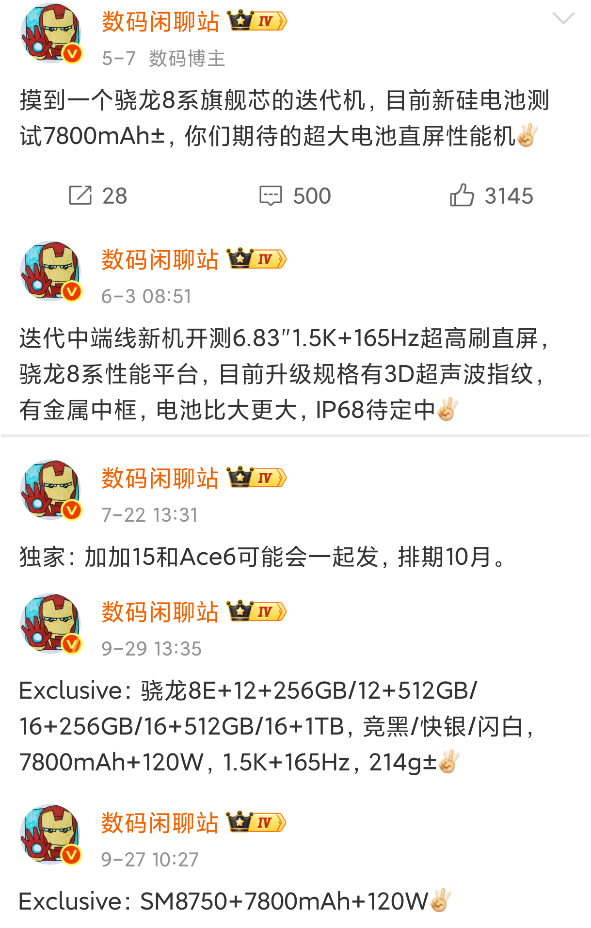 6.83"2800*1272p 1.5K+165Hz LTPS,金属中框,玻璃机身,前置16Mp,后置50Mp+8Mp,骁龙8 Elite,7800mAh双电芯+120W闪充,3D超声波指纹,IP66/IP68/IP69/69K,8.32mm/213g