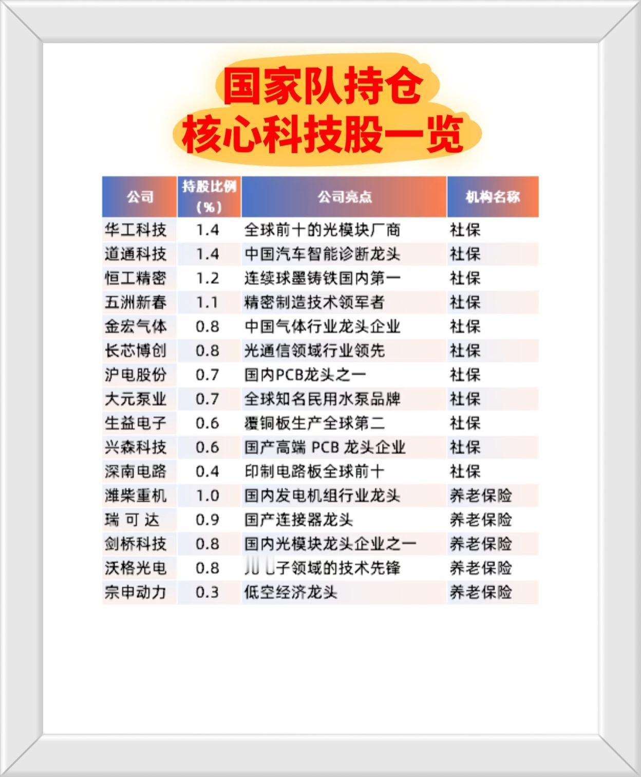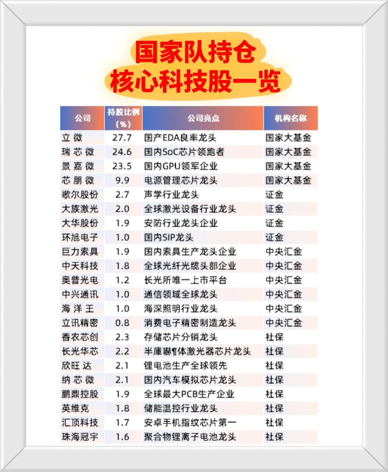 “国家队持仓核心科技股一览” 1. 国家大基金(国家集成电路产业投资基金) - 涉及企业几乎全部为半导体、芯片、EDA、光电、封测等产业链关键环节的龙头企业,例如: - 华润微(82.9%):拥有完整半导体产业链; - 沪硅产业(80.0%):国内硅片巨头; - 北方华创(77.4%):半导体装备领军者; - 华大九天(77.2%):中国第一大EDA厂商; - 中芯国际(47.1%):国产代工绝对龙头; - 长电科技(43.3%):世界第三芯片封测龙头; - 通富微电(41.8%):全球封测龙头之一; - 三安光电(56.7%):国内光电领域龙头; - 中微公司(71.6%):半导体刻蚀机龙头; - 格科微(75.1%):全球CMOS芯片龙头; - 还包括士兰微、华虹公司、芯原股份、中船特气、佰维存储、江波龙、机器人、华天科技、长川科技等。 2. 证金、中央汇金 - 主要出现在第二张图片中,持股比例相对较小(大多在1%~3%之间),但覆盖企业较为多元,不仅限于半导体,还包括消费电子、通信、安防、精密制造等领域。 - 代表企业包括: - 歌尔股份(2.7%,证金):声学行业龙头; - 大族激光(2.0%,证金):全球激光设备行业龙头; - 大华股份(1.9%,证金):安防行业龙头; - 环旭电子(1.0%,证金):国内SIP龙头; - 中兴通讯(1.0%,中央汇金):通信领域全球龙头; - 立讯精密(0.8%,中央汇金):消费电子精密制造龙头; - 中天科技(1.8%,中央汇金):全球光纤光缆头部企业; - 奥普光电(1.2%,中央汇金):长光所唯一上市平台; - 巨力索具(1.9%,中央汇金):国内索具生产龙头企业; - 海洋王(1.0%,中央汇金):深海照明行业龙头。 3. 社保基金 & 养老保险基金 - 代表企业包括: - 立微(27.7%,国家大基金):国产EDA良率龙头; - 瑞芯微(24.6%)、景嘉微(23.5%):SoC与GPU芯片企业,均为国家大基金持仓; - 芯朋微(9.9%,国家大基金):电源管理芯片龙头; - 香农芯创(2.3%,社保):存储芯片分销龙头; - 长光华芯(2.2%,社保):半导体激光器芯片龙头; - 欣旺达(2.1%,社保):锂电池生产全球领先; - 纳芯微(2.1%,社保):国内汽车模拟芯片龙头; - 鹏鼎控股(1.9%,社保):全球最大PCB生产企业; - 英维克(1.8%,社保):储能温控行业龙头; - 汇顶科技(1.7%,社保):安卓手机指纹芯片第一; - 珠海冠宇(1.6%,社保):聚合物锂离子电池龙头; - 华工科技(1.4%,社保):全球前十光模块厂商; - 道通科技(1.4%,社保):中国汽车智能诊断龙头; - 恒工精密(1.2%,社保):连续球墨铸铁国内第一; - 五洲新春(1.1%,社保):精密制造技术领军者; - 金宏气体(0.8%,社保):中国气体行业龙头企业; - 长芯博创(0.8%,社保):光通信领域领先; - 沪电股份(0.7%,社保):国内PCB龙头之一; - 生益电子(0.6%,社保):覆铜板全球第二; - 兴森科技(0.6%,社保):国产高端PCB龙头; - 深南电路(0.4%,社保):印制电路板全球前十; - 潍柴重机(1.0%,养老保险):国内发电机组行业龙头; - 瑞可达(0.9%,养老保险):国产连接器龙头; - 剑桥科技(0.8%,养老保险):国内光模块龙头之一; - 沃格光电(0.8%,养老保险):光电子技术先锋; - 宗申动力(0.3%,养老保险):低空经济龙头。