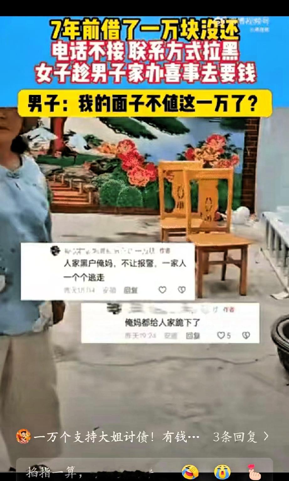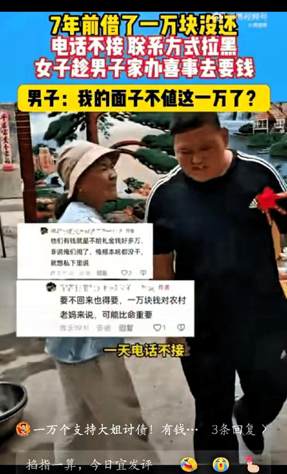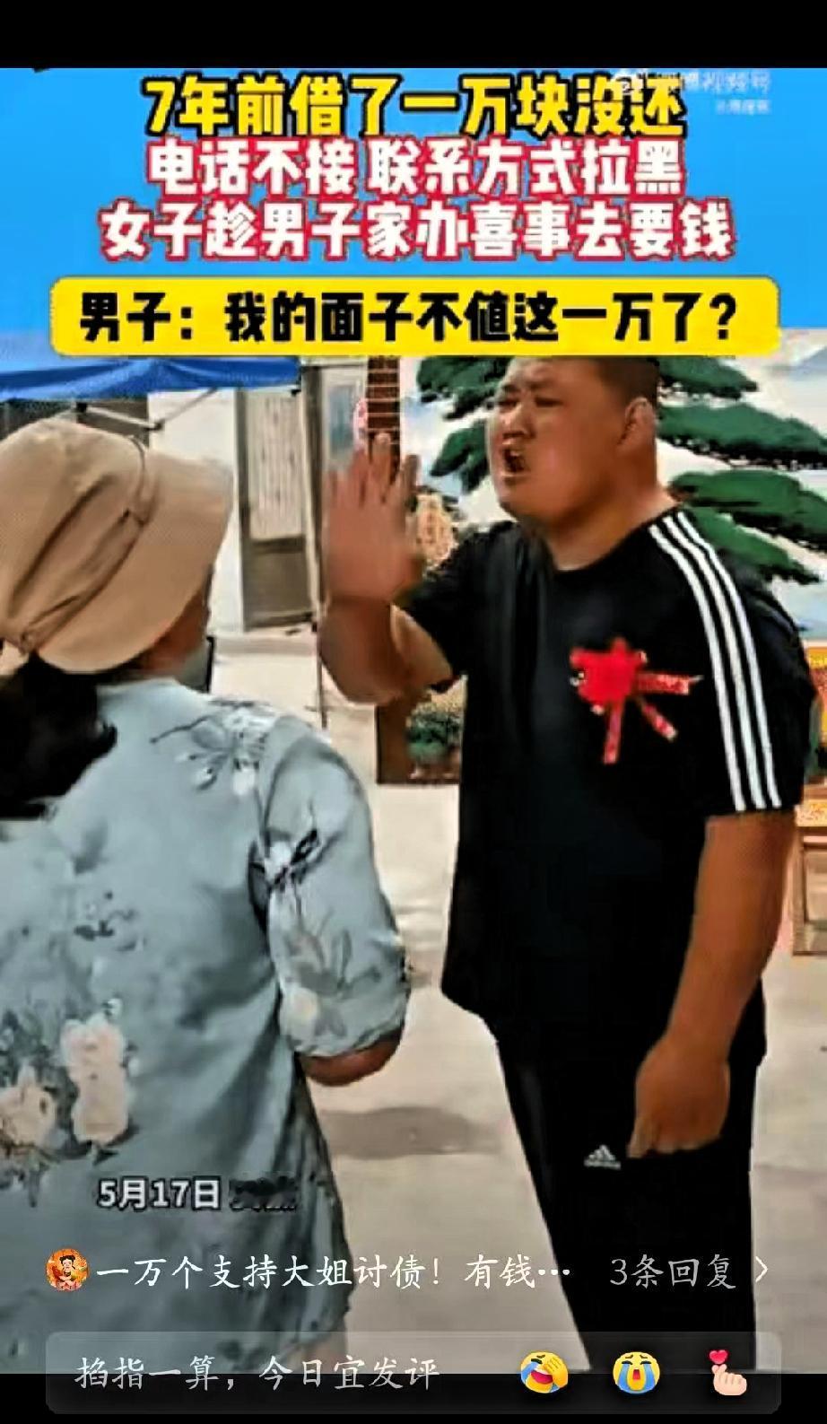 丢脸丢到家了!”安徽,有一名男子在老家为儿子操办婚礼,原本热闹的喜宴突然安静下来。 一位大姐,找到新郎父亲,拿出借条和转账记录,要求归还七年前的1万块钱,现场气氛瞬间变得尴尬。 七年前,男子生意遇挫,连基本周转都困难,大姐出于好心,主动借给他1万块救急,当时男子承诺缓过来就还。可没想到,后来他生意好转,却对这笔欠款绝口不提。 大姐这七年里多次上门催要,男子总以各种理由推脱,一会儿说资金紧张,一会儿说忘了这事,转头却花大价钱给儿子办婚宴。 当天面对铁证,男子没法再抵赖,说:“我的面子不值一万块钱!”亲戚们也开始小声议论,有人说“当初人家帮了你,现在赖账太不应该”,也有人私下感叹“怎么选在婚礼上要债”。 其实大姐心里也清楚场合特殊,可七年的等待实在耗光了耐心,若不是男子一次次失信,她也不会走到这一步。 别纠结“场合合不合适”,先想想欠债不还的错在先。人家在你难时伸援手,你却揣着良心装糊涂,丢面子不是因为讨债的人,而是自己没守住诚信。真正的体面,从来不是办多风光的婚礼,而是说到做到、知恩图报。 你们觉得大姐在婚礼上讨债,真的过分吗?