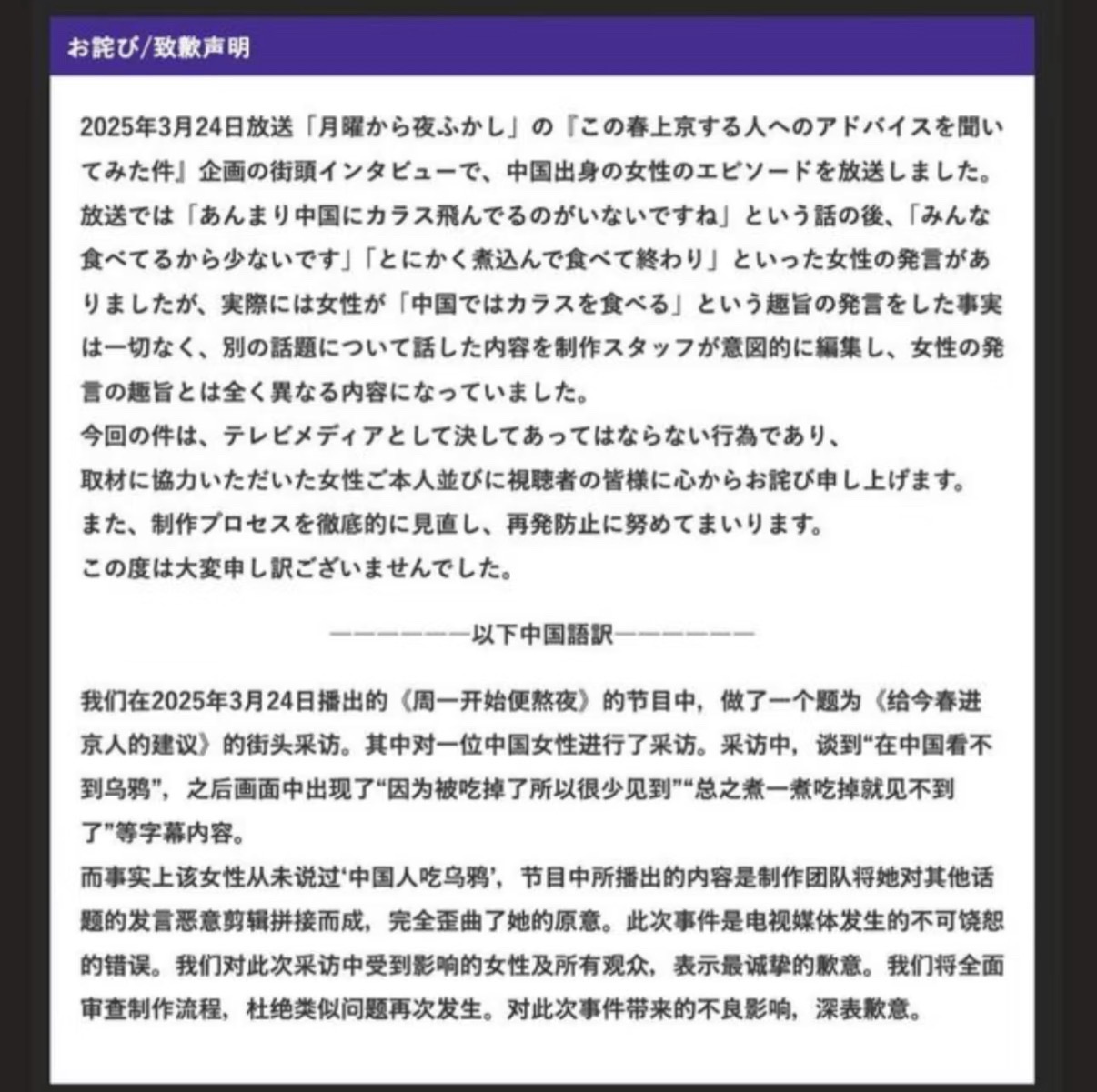 前几天日本电视台播放的中国女生说的“中国之所以很少看到乌鸦,是因为被煮着吃了!” 终于承认是剪辑后捏造而成的。