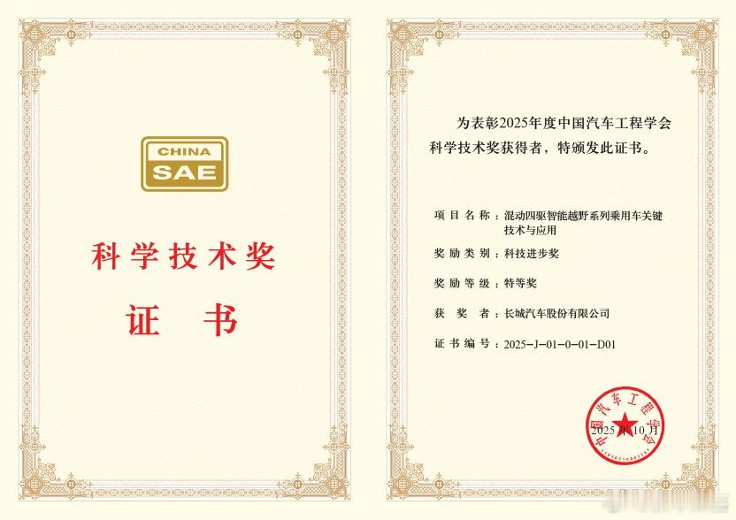 刷到个行业重磅消息!2025年10月长城汽车《混动四驱智能越野系列乘用车关键技术与应用》,拿了中国汽车工程学会科技进步奖特等奖,这可是该奖项 30 多年来,首次把这个最高荣誉给混动技术,还是李骏院士领衔专家团严格评的,够有分量[666]
