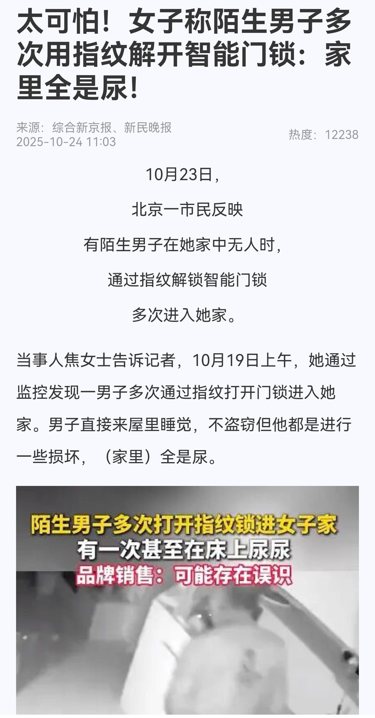 怎么这样啊?2025年10月23日,北京一位女士反映,视频清晰显示一个陌生男子在她家无人时,多次进入她家,从大门解锁指纹智能门锁,用自己是指纹进了家的! 女士称,10月19日上午,她通过监控发现该男子多次用指纹打开门锁进入,不盗窃,但是在她家里睡觉、还在家里到处撒尿 。 用指纹锁,本来图个方便,不用带钥匙,结果陌生人都能随便进家了,这不成了“方便”坏人了吗? 新闻里品牌方解释说“指纹非常接近导致误识”,这系统太好骗了吧? 最糟心的是,小偷不偷东西,而是睡完觉了,还到处撒尿,有一次居然还在床上撒尿!这种精神上的侵犯,比丢个电脑手机还让人膈应。 女士说这锁是2024年和门一起才新买的,按理说是最新技术了吧!结果还是出这种事? 目前警察已经介入,希望最终结果不仅能给女士一个交代,智能锁能真正做到“万无一失”。陌生人能随意进入,厂家说概率低,可一旦发生在自己家里,谁又能承担得起这个万一呢? 信息来源:百姓关注