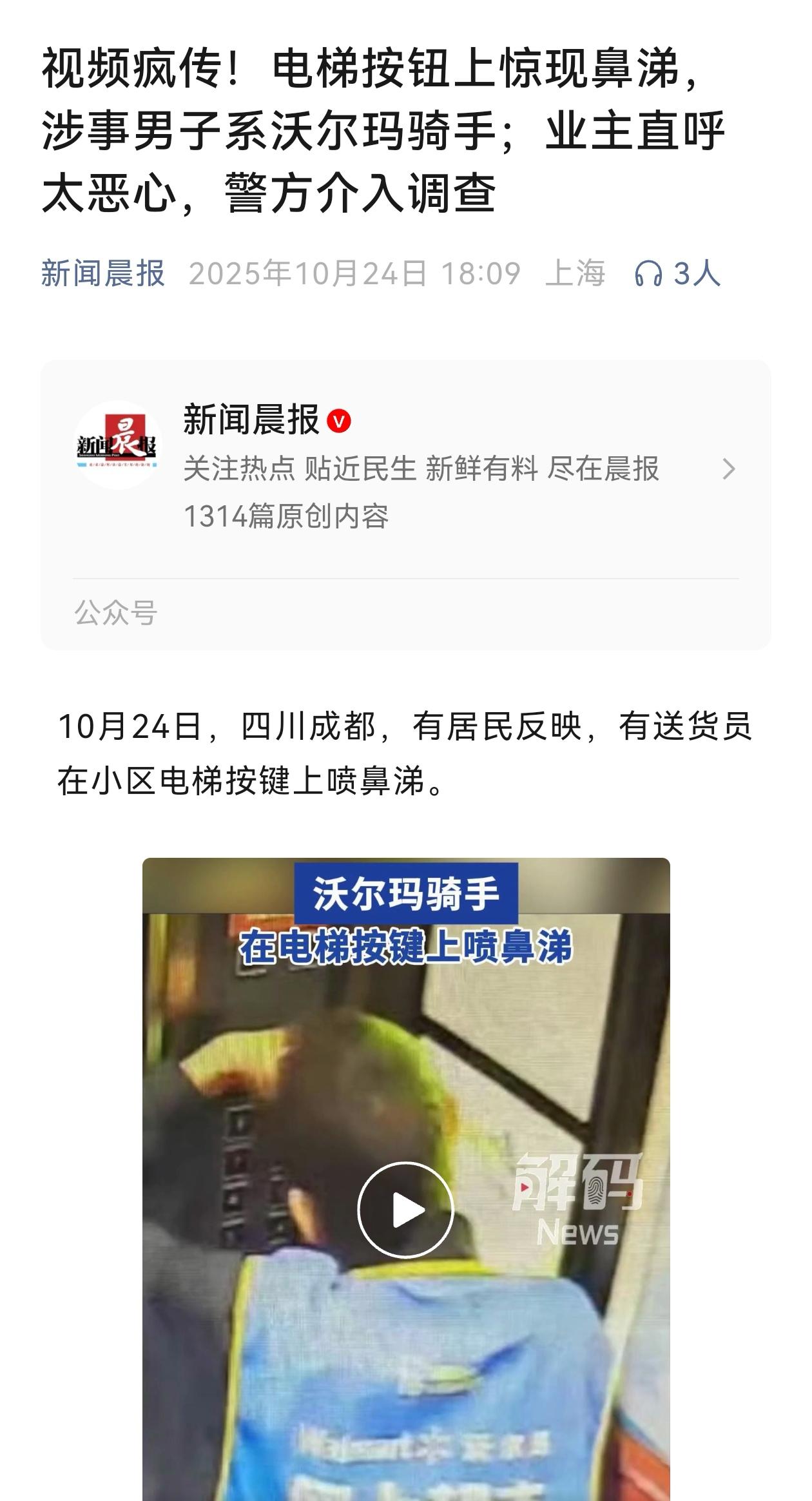 2025年10月24日,四川成都一个小区,有一个穿蓝色马甲的某大型超市的送货员,在乘坐小区电梯时,本来在看手机,突然做了一个喷鼻涕的举动。 本来在公众场合随意喷鼻涕,就是不文明行为,而这位送货员更加匪夷所思,居然将鼻子凑进电梯按键区域,故意将鼻涕喷到电梯按键上! 虽然居民选择报了警,小区物业已立即对电梯进行消毒,但是整个小区都被恶心到了! 送货员工作确实辛苦,但是不管有多大怨气,这种损人不利己的事儿,能随便干吗?解气的方法有千万种,偏偏选了最埋汰、最招人恨的一种,大家能答应吗?肯定会追究到底啊! 这种撒气方式,真是得不偿失!就为了一时解气,坑了全楼的人,最终坑的不还是自己吗? 信息来源:青岛广电橘子资讯 新闻晨报