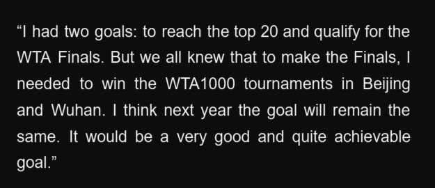 今年她赢了两个1000赛冠军,还两次打进大满贯八强。可惜赛季末的低迷状态,最终导致错过了一度看似超稳的总决赛门券。