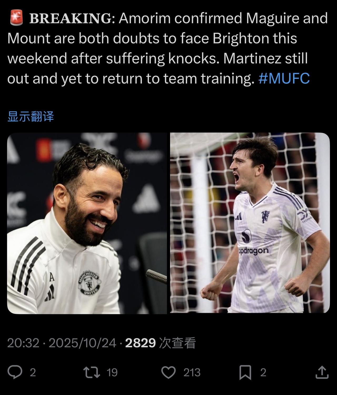 阿莫林确认,马奎尔和芒特均因受伤,能否在本周末对阵布莱顿的比赛中出场存疑。 马丁