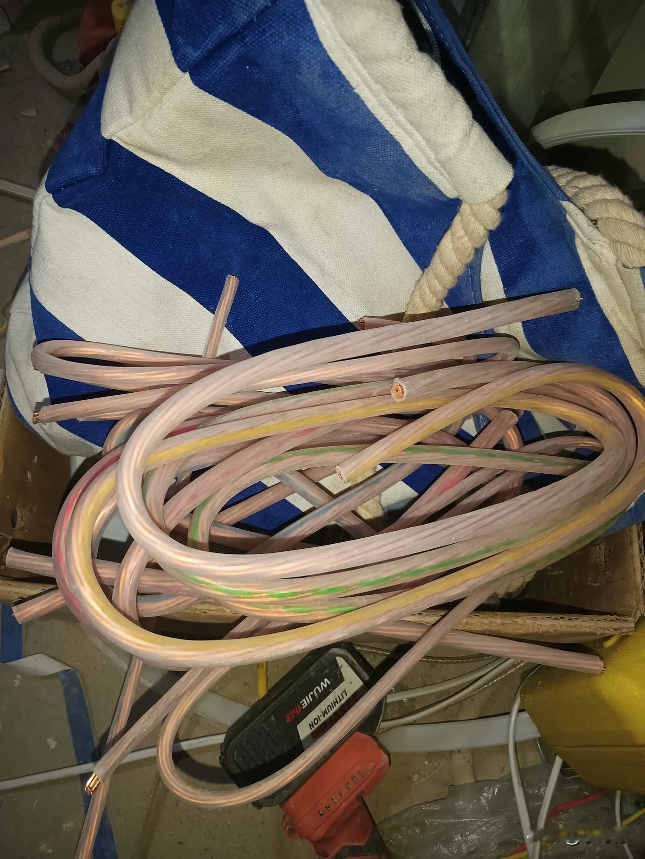电工装完配电箱,就剩下这些粗电线,足足塞满了小布包。三四斤重了,这种粗电线里面都是好几根铜芯。最近铜价涨得厉害,据说一斤废旧电线铜都卖到三十多块一斤了。老板也知道电工会拿去卖,但是都睁一只眼,闭一只眼了。这电工不仅挣一份工资,这些线拿出去又能换上一百多块钱了。所以说,人还是得有门技术,技术越高挣钱就越容易。铜线电线 接线配电箱