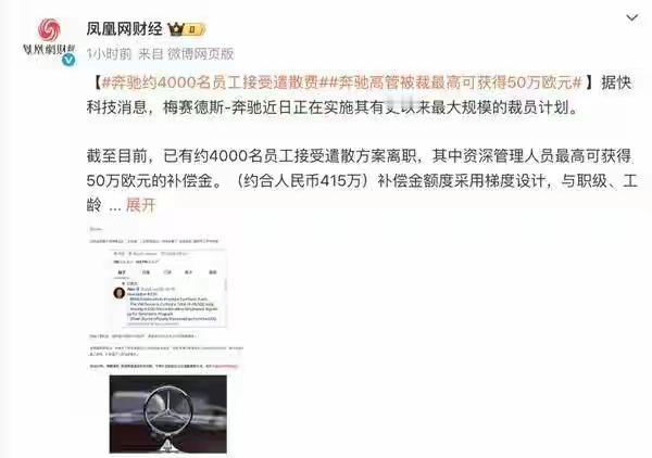 10月24日报道,四千多人抢着签字离职,最高能拿四百多万补偿金!这不是在裁员,这分明是在撒钱啊!但仔细一想,这事儿背后藏着奔驰说不出的痛! 奔驰的“自愿离职计划”火得不得了,4000多人抢着签字走人。 资深管理层最高能拿50万欧元,差不多400万人民币,普通工人干满十年也能领90多万。 今年年初,奔驰CEO奥拉·卡列尼乌斯突然宣布,要启动史上最大规模的自愿离职计划,目标是鼓励3万名员工主动离开。 他还强调“不强迫、不解雇”,但给的补偿非常慷慨。 补偿按职级和工龄分等级,干得久、职位高的人拿得多:比如一名工作30年的中层管理者,补偿金能等于月薪×60个月,55岁的部门经理光补偿金就能超过392万人民币。 普通干满10年的质检员也能领90万人民币,完全比不少人一辈子赚的还多。 为了让大家早点决定,奔驰还加了“加速奖金”,签得早、拿得早。 条件一出,员工自然抢着签。 到10月,已有4000人离职,还有人排队申请。 有网友调侃:“奔驰门口现在不是来应聘的,全是打听离职流程的。” 但奔驰花这么多钱“买人走”,绝不是慈善。 2025年上半年,奔驰税后净利润暴跌55.8%,全球销量下滑,中国市场更惨,第三季度在华销量下降27%,主打的纯电EQ系列,一个月才卖103辆,连造车新势力的零头都不够。 电动化转型也卡壳:早期搞“油改电”留下一堆续航问题,后来搞纯电平台,又慢半拍,智能系统被中国车企甩开。 更让人头疼的是管理层太臃肿。 数据显示,奔驰管理岗位比行业平均高出30%,层层审批拖慢了转型节奏。 德国劳动法规定行政岗位2034年前不能随便裁,硬裁既可能官司缠身,又会和工会闹僵。 权衡之下,奔驰才搞出“自愿离职”这招:用高额补偿换员工主动走,既规避了法律风险,也能保住“负责任雇主”的形象,精算师算得明明白白。 奔驰的算盘很清楚:省下来的钱全砸进电动化。 计划显示,这些离职能让公司到2027年每年节省50亿欧元,用于电动汽车和自动驾驶研发,还准备推出17款电动新车和7款中国专属车型,显然想在中国市场硬拼。 更重要的是“换血”,45岁以上员工占比从38%降到28%,给懂电池、懂智能系统的年轻人才腾位置,因为内燃机工程师的经验,在电动车时代不够用了。 但这招也有风险。 有老员工感慨:“三代人都在奔驰干活,现在拿了钱却丢了根”,机械工程教授更直言:“培养一个高级模具师要20年,流失了就是技术断代。” 在中国区影响更明显,理想等新势力已经盯上奔驰离职员工,开出“奔驰工龄×2倍月薪”的签约奖,等于给对手送人才。 现在离职潮还在继续。 拿到400万补偿的人表面赚了,但内燃机岗位消失带来的尴尬和心理落差很大。 奔驰花了上百亿买转型时间,能不能在电动化赛道追上对手还是未知。 网友总结得直接:“别羡慕补偿金,这是传统车企为时代交的学费。” 说到底,奔驰这波“撒钱离职”,不是福利,是百年老牌车企在电动化浪潮下的无奈选择。 燃油车的黄金时代过去,再高的补偿金也买不回错失的转型机会,这才是奔驰最头疼的痛。 信源:大象新闻